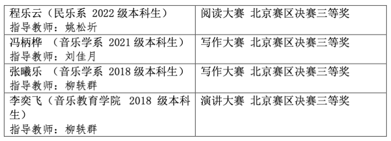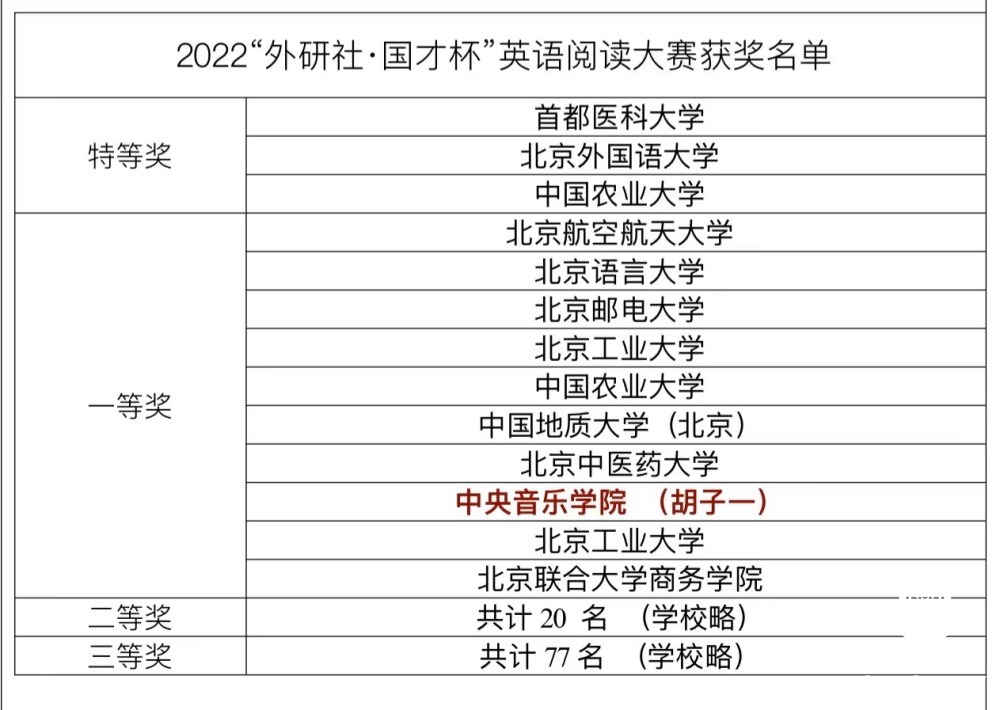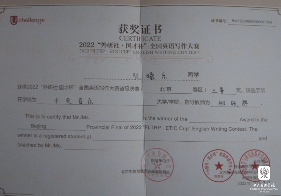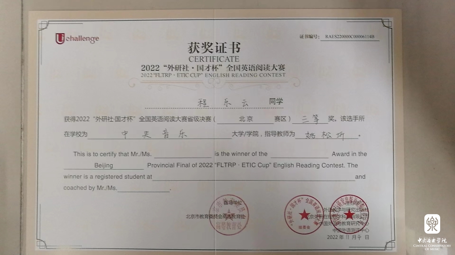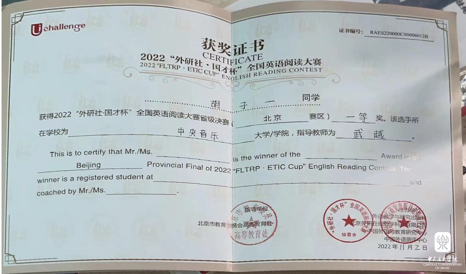近日,2022年“外研社·国才杯”全国英语大赛北京赛区传来喜讯,永利音乐人工智能与音乐信息科技系硕士研究生胡子一(指导教师武越)荣获英语阅读大赛北京赛区决赛一等奖,这是永利学子连续第二年斩获此项大赛的一等奖。