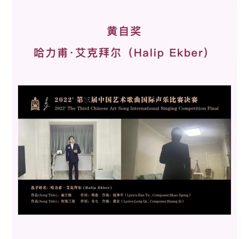 本次比赛报名选手637人,有10个国家和地区人员参赛,经过初赛、复赛、决赛三轮,最后11人获奖。哈力甫决赛以一曲《玫瑰三愿》获得了“黄自奖”。他对于歌曲的诠释和非母语语言韵味的把握,足以呈现了平日学习的努力以及指导教师扎实的教学成绩。他对待生活的执着和坚持,在逆境中寻找动力的坚持,对遭遇疫情突袭的声歌系学生是一个激励。
