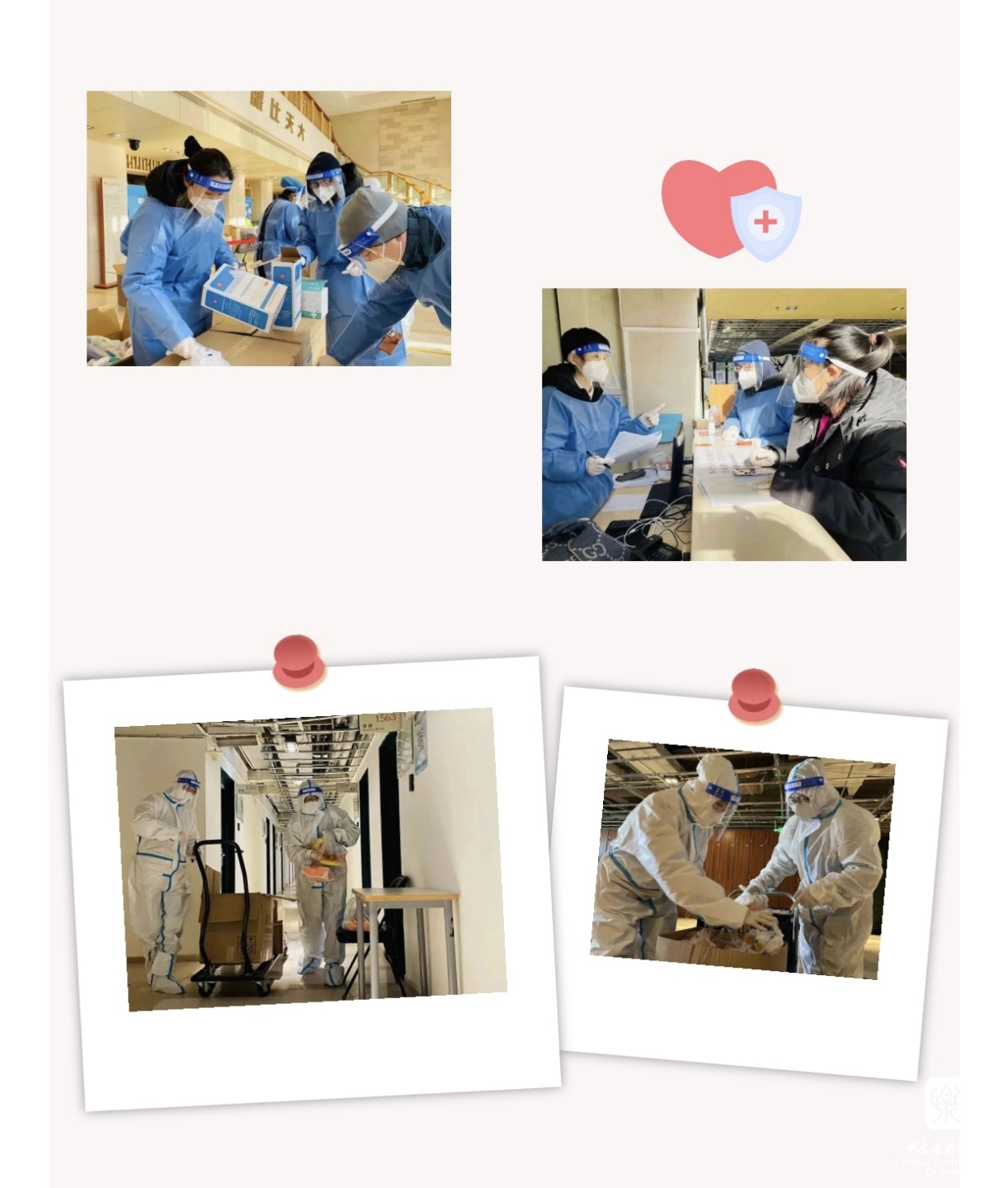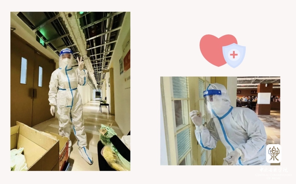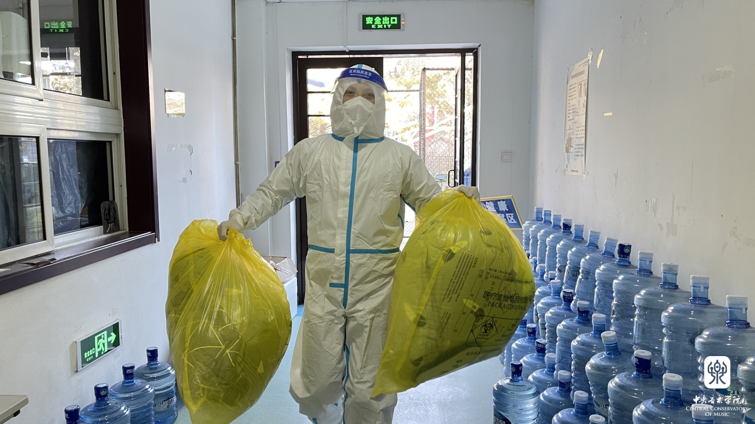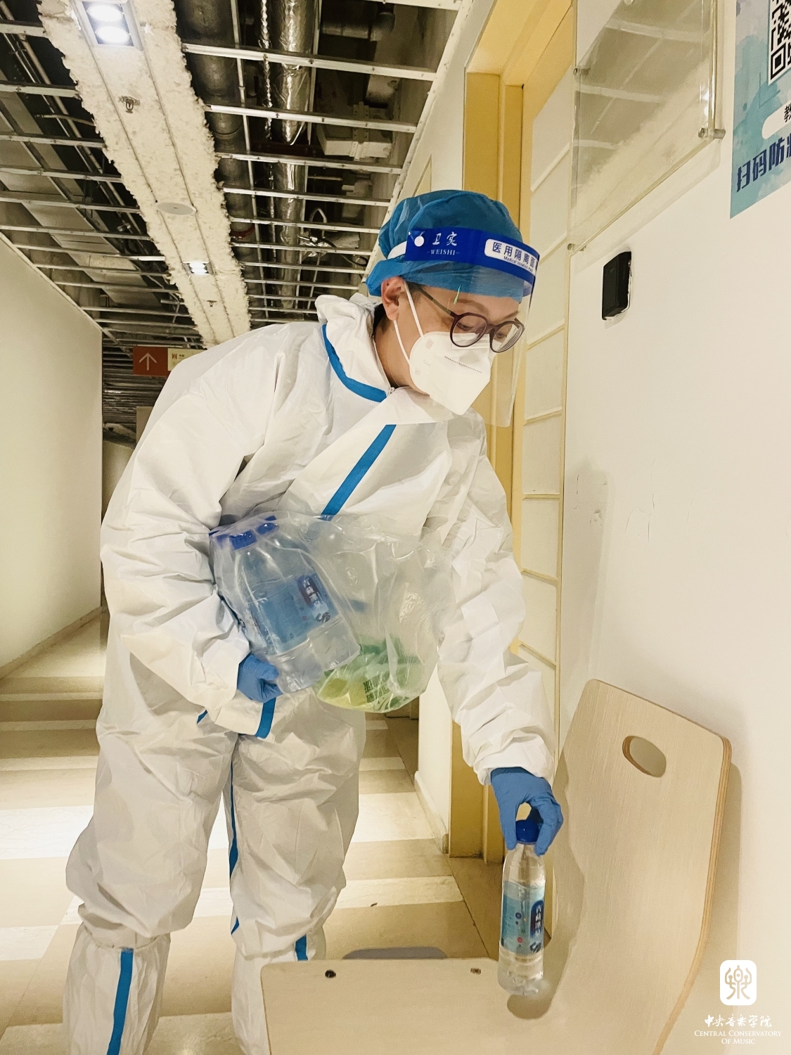 我是第一批进校支援的教师志愿者,被分配在女生本科宿舍负责给5-7层住宿生发餐及运送物资。每日三餐加上快递和kc外卖,上上下下运送近十几次。因为要穿防护服,搬两个箱子就汗流浃背了,汗水雾气浸湿面罩,视线总是模糊的。一同出力的大白老师相见只能听声识人,大家互相帮助,干劲十足。我们戏称自己是央音特种小分队,再有机会还要一起并肩作战。由于白天的体力消耗,夜里会因为腰酸背疼得睡不着,第二天早上六点依然精神抖擞换上大白继续工作,希望早一点把饭菜送给学生,让他们吃着热乎乎的,我们心里也暖洋洋的。五天过去,宿舍成功解封了,听到学生们的欢声笑语,一切付出都是快乐的!
