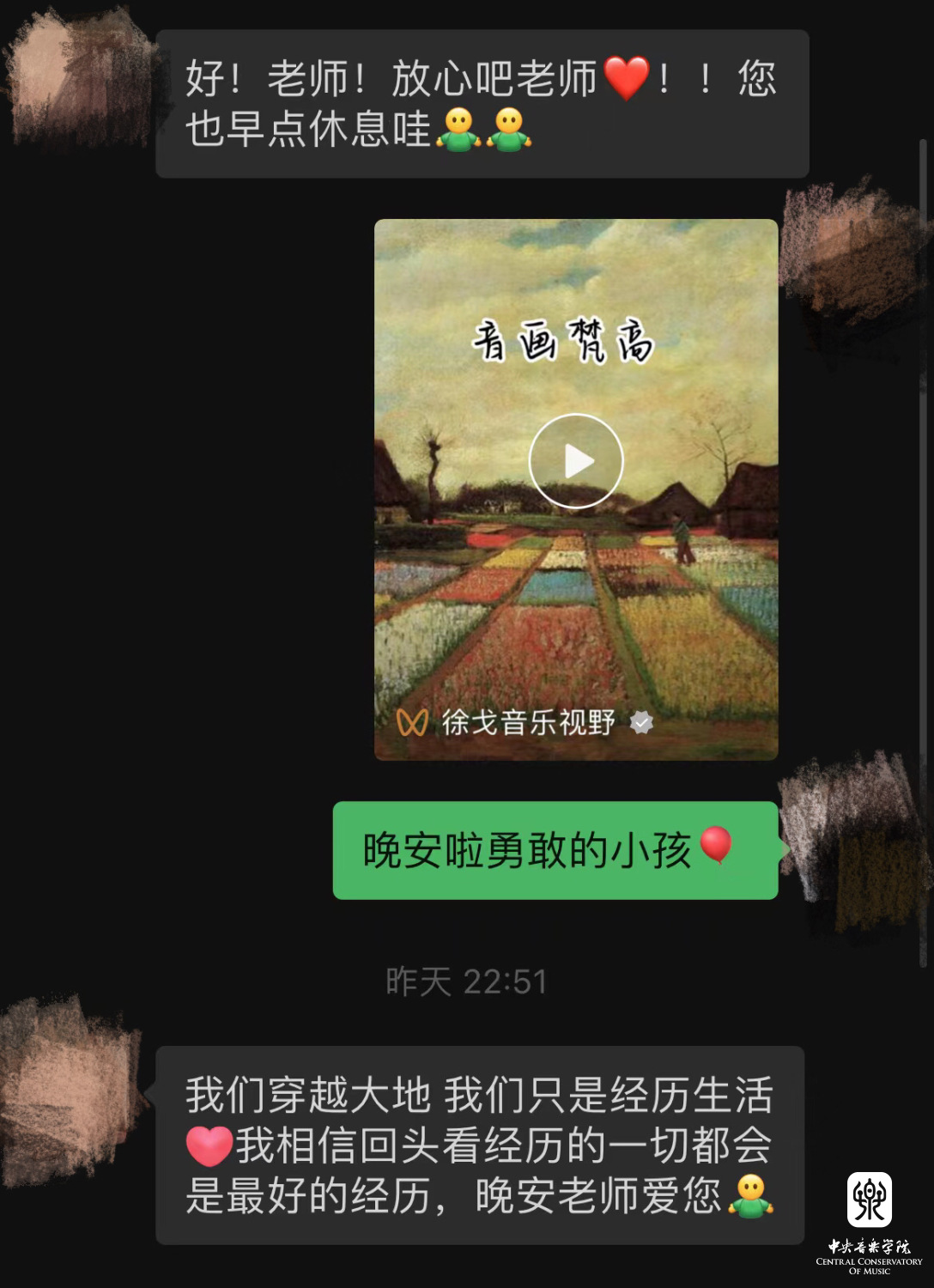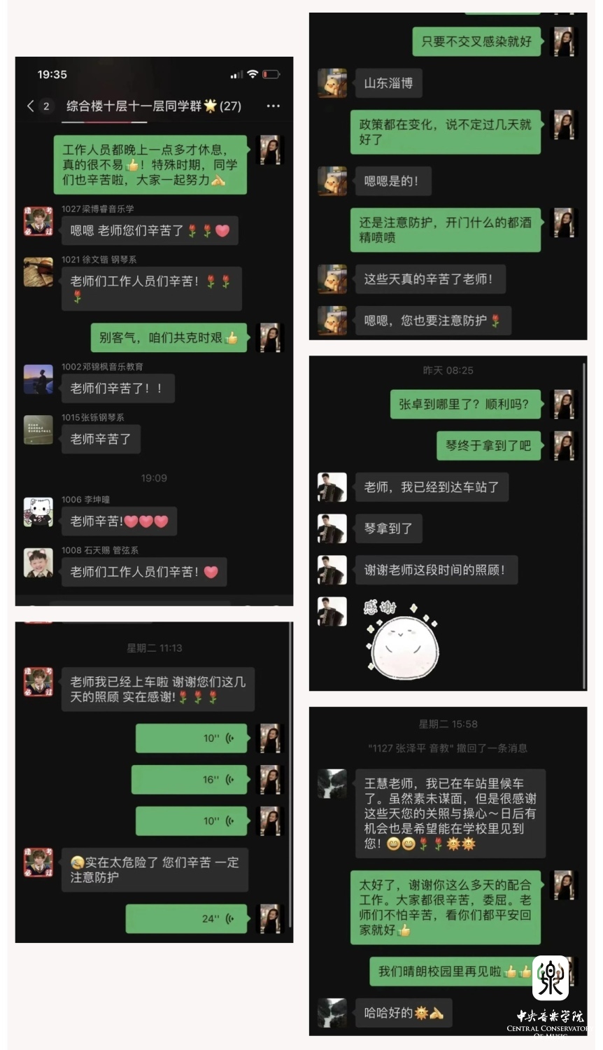 疫情面前,无人可独善其身。做为一名党员,一名央音人,唯有勇挑重任、逆流而上,方能践行初心、担当使命。工作期间,系领导韦丹文等老师几乎每天都会发来信息关心慰问我们的情况,工作中与老师们、同学们的点滴细节,最终也汇成了一段难忘的、特别的记忆。临行前,发给各层学生的信息被我保留了下来,三年过去了,新的春天即将到来。