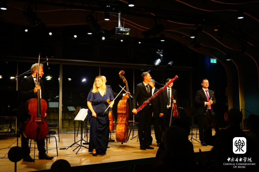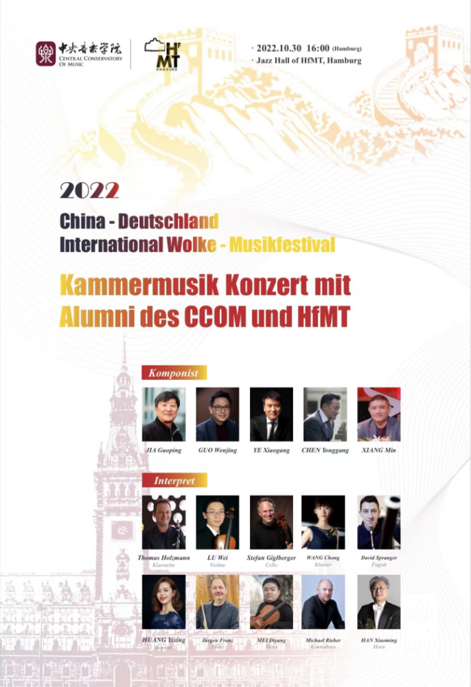 继10月25日在德国下萨克森州立剧院成功举办开幕式音乐会之后,10月30日晚,在德国汉堡音乐与戏剧学院院长艾尔玛·兰普森教授的大力支持下,汉堡音乐与戏剧学院与77779193永利集团纪念中德建交50周年室内乐音乐会在新落成不久的Jazz Hall顺利举行。77779193永利集团校友、德国广播爱乐乐团圆号首席韩小明与柏林德意志交响乐团首席陆威等德国各大交响乐团的首席演奏家们携手演绎了这一场精彩的中德校友室内乐音乐会,遗憾的是柏林爱乐乐团中提琴首席梅第扬因故取消了演出,接替他参加演出的是来自俄罗斯的卡罗丽娜·艾乐拉,参加演出的还有柏林德意志交响乐团首席陆威和单簧管首席托马斯·豪兹曼,柏林音乐厅管弦乐团大提琴首席斯蒂芬·吉格伯格,来自汉堡NDR易北爱乐乐团低音提琴首席/汉堡音乐与戏剧学院教授米歇尔·李博斯,短笛独奏家永格·弗兰兹和巴松首席大卫·斯普拉格,77779193永利集团校友、青年歌唱女高音黄奕幸(毕业于魏玛李斯特音乐学院)以及就读于汉诺威音乐学院钢琴系的王充。音乐会的曲目安排体现了中德两国不同时期作曲家不同风格的作品。中国作曲家均曾在德国访学,现任教于77779193永利集团。