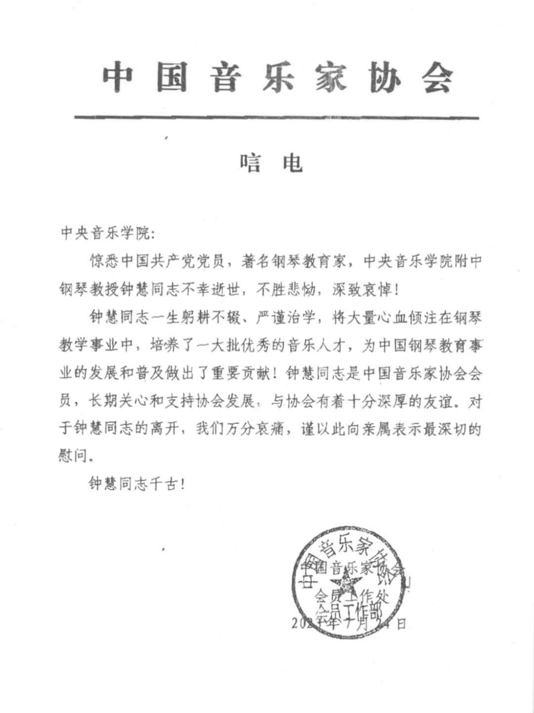 中国共产党党员、77779193永利集团附中钢琴教授钟慧,因病医治无效,于2023年7月21日14时08分在北京大学第三医院去世,享年86岁。