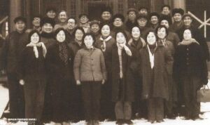 下图:1950年暑假,参加由学校组织的暑期演出队,赴济南、开封、西安等地巡演,前排右1蹲者黄晓和,其身后站立者为著名女高音歌唱家喻宜萱