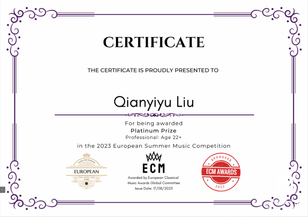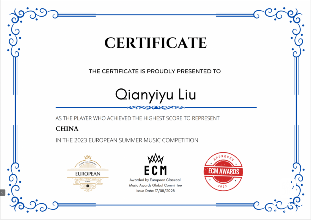 刘骞毅雨同学在整个比赛过程中展现出高超精湛的专业水平,在众多选手中脱颖而出,最终取得其艺术生涯又一个灿烂瞩目的好成绩。