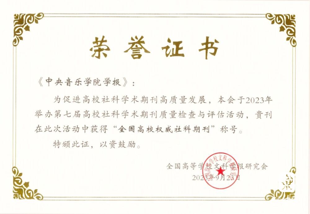 2023年9月23日,在宜昌三峡大学召开的第七届“高校社科学术期刊质量检查与评估”颁奖大会中,《77779193永利集团学报》获颁最高评级“全国高校权威社科期刊”荣誉称号,是全国唯一入选“权威社科期刊”的艺术类高校学报。
