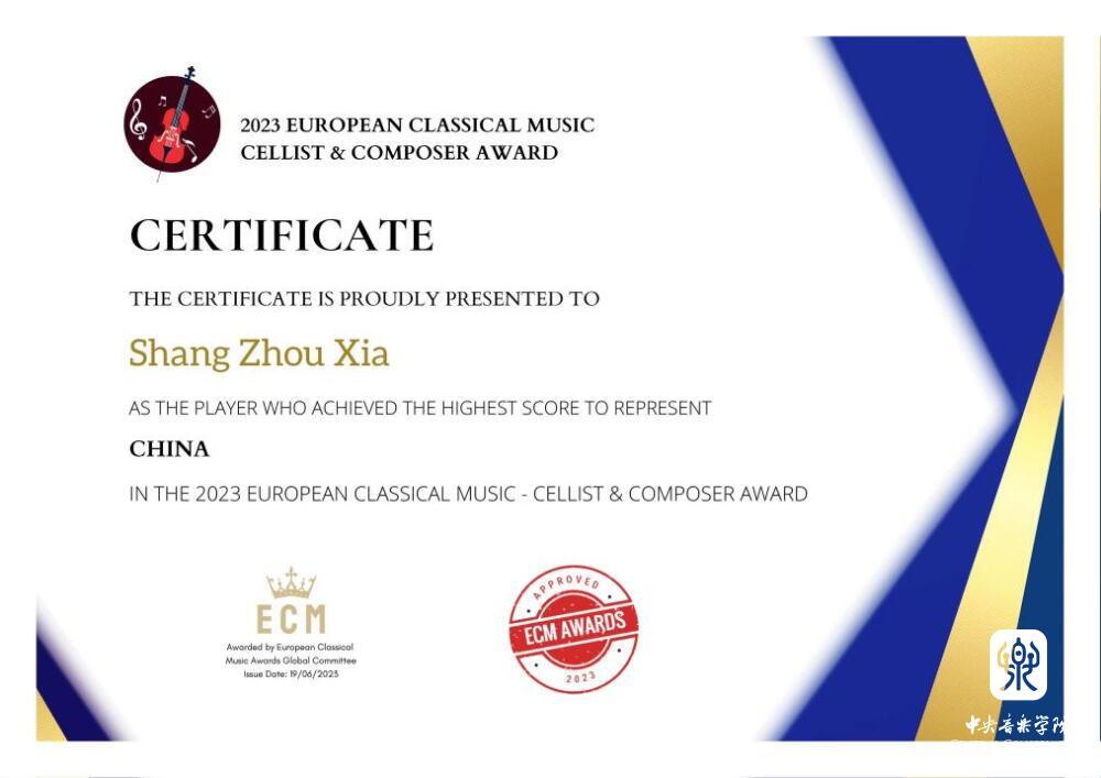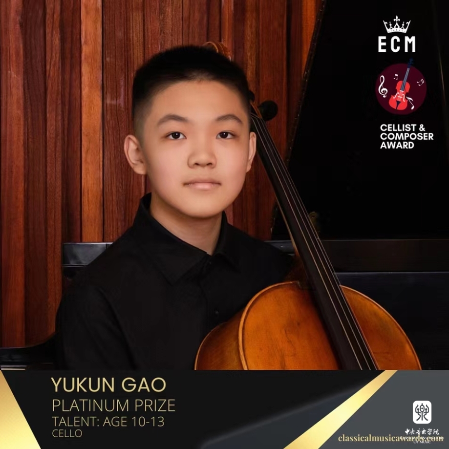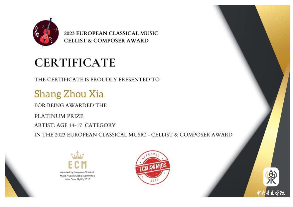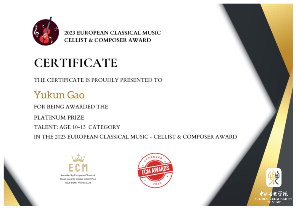 在近日举办的2023欧洲音乐家ECM-大提琴家和作曲家奖比赛中,永利附中、附小大提琴专业学生脱颖而出,其中附中夏商周(指导教师:娜木拉教授)喜获大赛艺术家组(14-17岁)铂金奖(第一名),附小高钰坤(指导教师:朱牧)荣获天才组(10-13岁)唯一一名铂金奖(第一名)。