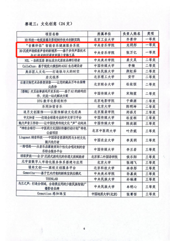 近日,北京市教育委员会、北京高校大学生就业创业中心公布了第二届“京彩大创”北京大学生创新创业大赛分赛道现场决赛获奖名单,经过前期项目孵化、学校推荐报名、市级网评初赛、市级网评复赛、市级分赛道现场决赛,永利2个参赛项目《“音藥伴侣”智能音乐健康服务系统》(负责人:龙玥彤<2022 级音乐学系硕士>,指导老师:姚越,团队成员:王郁尧<2022 级音乐学系硕士>、毕潇丹<2022 级音乐学系硕士>、杨瑞<2021 级作曲系博士>、王一然<2022 级音乐学系硕士>、苏家兴< 清华大学在读硕士>、王译晗< 墨尔本大学在读硕士>、Xuyuan Cai< 加州大学圣克鲁斯分校在读硕士>)和《3D沉浸声场探索声音的新境界——基于多传声器技术与AI技术的沉浸声声场上变换工具》(负责人:张万亿<2022 级音乐人工智能与音乐信息科技系硕士>,指导老师:李小兵、朱诗家,团队成员:钱轶恺<2021 级音乐人工智能与音乐信息科技系博士>、李志尚< 首都师范大学在读本科>、张海桦< 首都师范大学在读本科>)分别获得文化创意赛道一等奖。