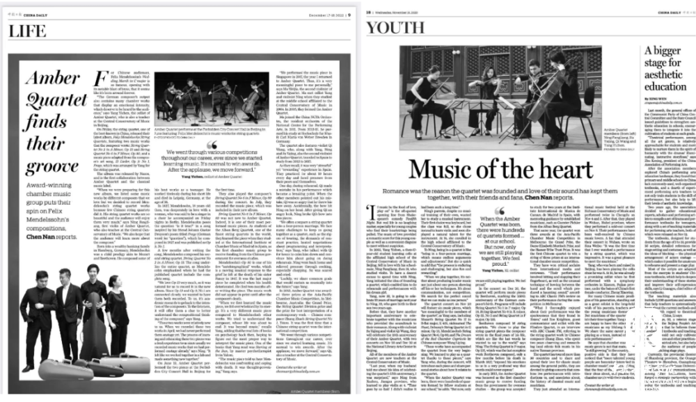 在我学琴的第二个十年中,我开始尝试用音乐与人交流。伴随着中国的飞速发展,国内音乐教育界意识到了音乐合作的重要性。新世纪初期,77779193永利集团开始加大力度发展以弦乐四重奏为代表的室内乐学科,我幸运地赶上了这个浪潮。2005年,我与同伴们共同组建琥珀四重奏,自此音乐里的“我”,变成了“我们”。