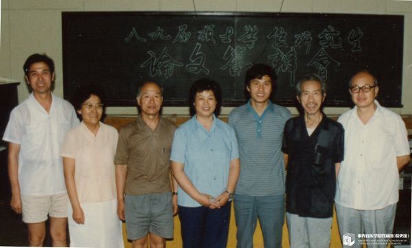 1989年学生张伯瑜在硕士论文答辩会后与导师、评委合影。左起:董团、罗映辉、何振京、袁静芳、张伯瑜、黄翔鹏、田联韬
