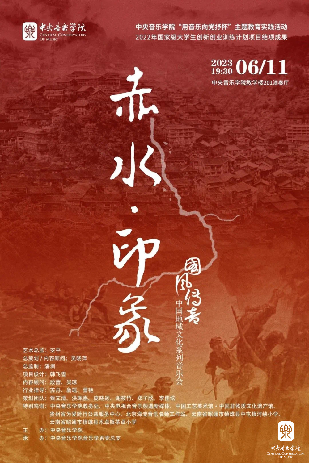 交融滇黔,文化长存。本场音乐会以红军“四渡赤水”的赤水河为灵感,结合音乐学系田野采风、社会实践等成果,围绕当地人文风韵,试图呈现一幅关于赤水的印象画卷,由此来展示云贵地区多元音乐文化以及一方水土的精神文明瑰宝,坚持党为人民服务的初心,奏响我党领导人民实现乡村振兴、共同走向美好生活的颂歌。