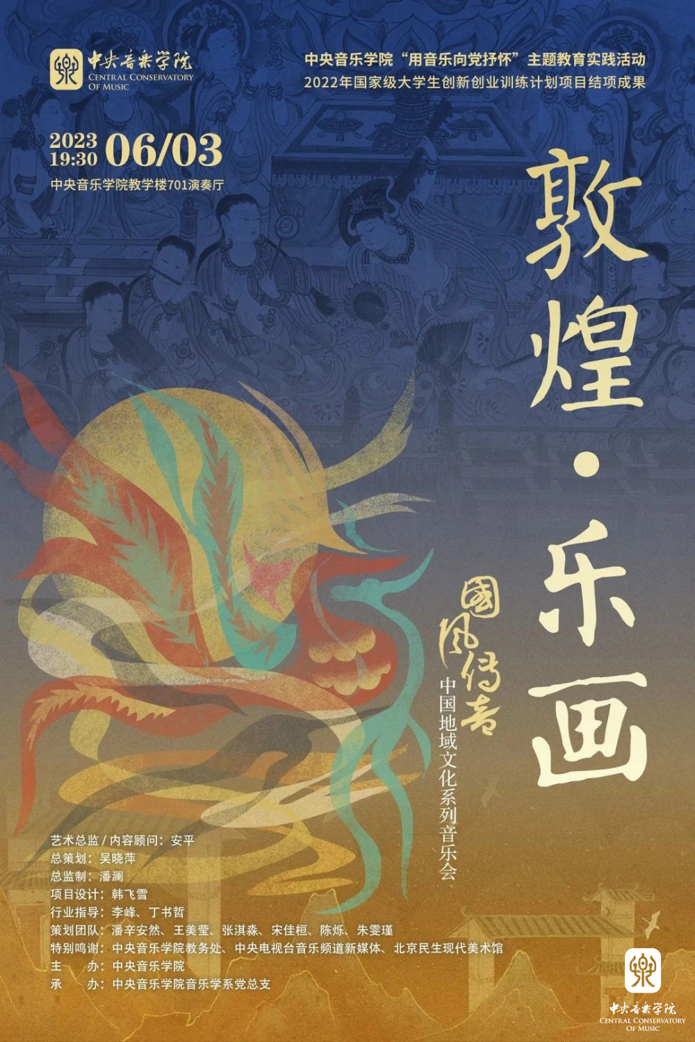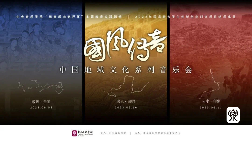 “国风传音”中国地域文化系列音乐会,以中国地域音乐文化为主题,以音乐赞美祖国、以音乐向党抒怀,探索中华优秀传统文化传承与发展的新路径。该系列共包含“敦煌· 乐画”“豫见·回响”“赤水·印象” 三场音乐会。音乐会将从敦煌异域文化、河南中原文化、云贵民族文化出发,围绕中外多元音乐的融合、中国传统音乐的复兴、少数民族音乐的传承等多个方面展开。