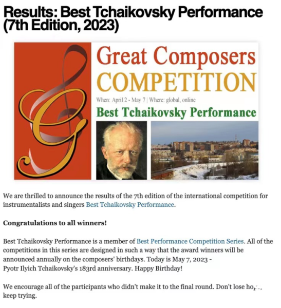 2023英国伟大作曲家比赛中获得最佳柴可夫斯基演奏比赛(IV组)一等奖