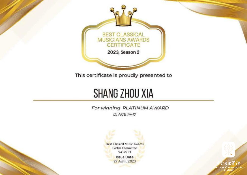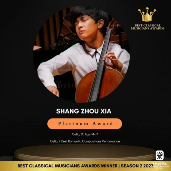 永利附中大提琴表演专业学生夏商周在刚刚结束的2023英国最佳古典音乐家大赛(Best Classical Musicians Awards 2023)中获得三个奖项:(14-17岁组)白金奖、表现力表演特别奖、最佳浪漫作品表演奖;同时在英国举办的2023伟大作曲家比赛(GREAT COMPOSERS COMPETITION)中获得最佳柴可夫斯基演奏比赛(IV组)一等奖。这是他相继获得2023古斯塔夫·马勒奖大提琴比赛中获青少年组(VI组)冠军、在2023第四届维也纳国际音乐比赛中获青少年组银奖以及在2023伦敦古典音乐比赛 (LCMC) 获大提琴青少年组二等奖之后又获得的一系列奖项,指导教师娜木拉教授。