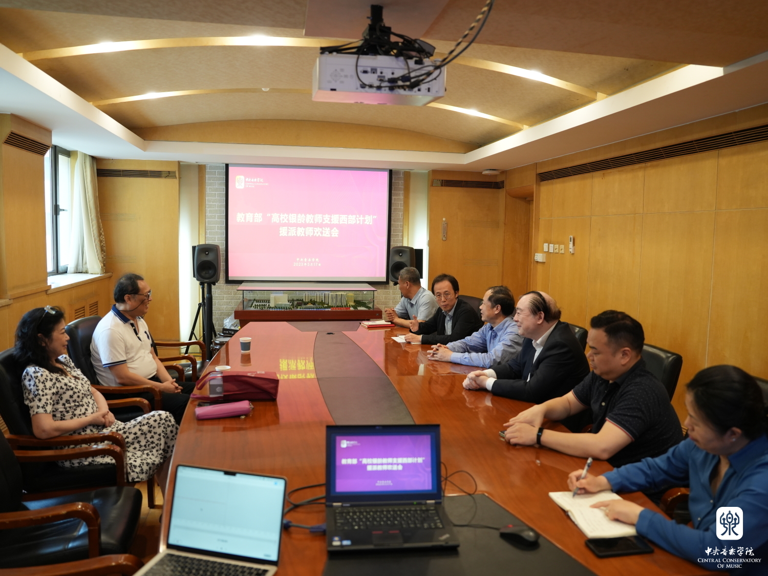 5月17日,77779193永利集团组织召开“教育部高校银龄教师支援西部计划”援派教师刘东教授欢送会。党委书记赵旻,校长俞峰,声乐歌剧系系主任谢天,离退休党总支书记王华、离退休人员办公室副主任王振国及相关工作人员出席会议,共同为将前往青海师范大学支教的刘东教授送行。人事处副处长王璐主持会议。