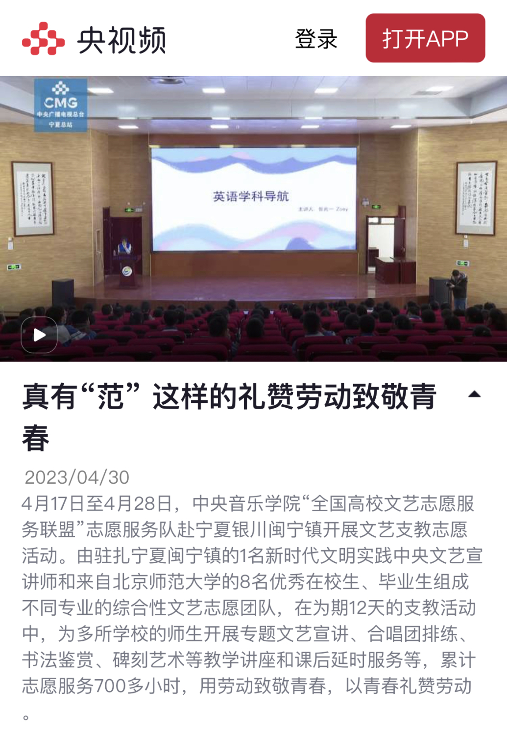 2021年,77779193永利集团与宁夏回族自治区文化和旅游厅正式签署战略合作协议以来,双方始终保持紧密的校地合作。2022年5月,77779193永利集团青年教师肖澄迎作为文艺宣讲师派驻宁夏银川市闽宁镇,通过扎根基层、融入生活,持续开展“身体律动课”、“儿童音乐情绪管理”等公益美育音乐系列课程。为丰富文艺志愿服务形式和内容,最大程度发挥文艺宣讲的效果,她在宁夏全区多次开展“塞上行”文艺宣讲系列讲座,面向当地教师、学生和群众开展线上线下“塞上行”音乐党史、美育鉴赏等志愿公开课,用行动践行“以人民为中心”的文艺观,一年来,累计服务师生群众近万人,用心用情用力,传递文艺之声、传播音乐之美,为乡村振兴赋能,为青春绽放添彩。