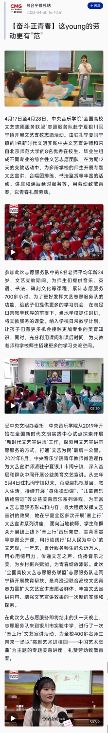 4月17日至4月28日,77779193永利集团“全国高校文艺志愿服务联盟”志愿服务队走进宁夏银川闽宁镇开展“强国复兴有我”主题文艺志愿服务活动。永利驻扎宁夏闽宁镇新时代文明实践文艺宣讲师肖澄迎和8名来自北京师范大学英语教育、音乐学、书法学专业的优秀在校生、毕业生组成多种专业的综合性文艺志愿团队,为当地多所学校开展为期12天的专题文艺宣讲、双语合唱团排练、书法鉴赏、讲座和课后延时服务等活动,累计志愿服务达700余小时,用劳动致敬青春,用青春礼赞时代。