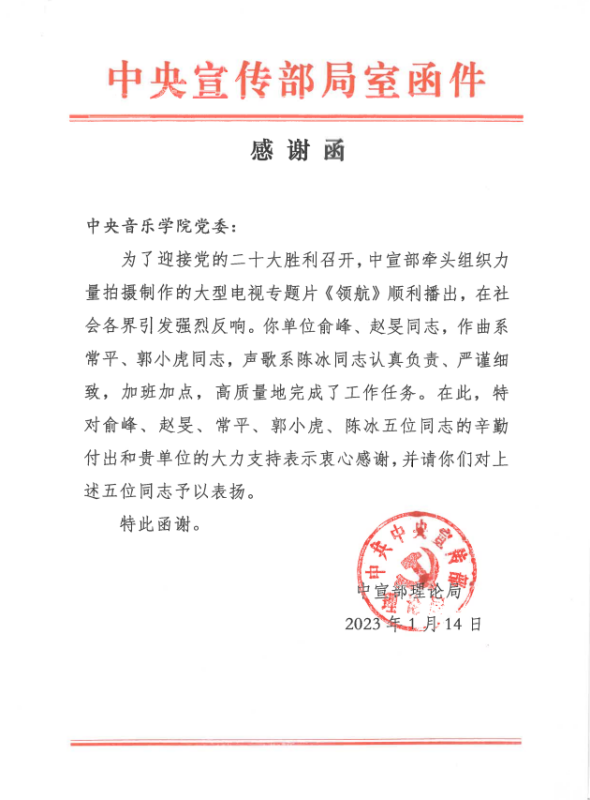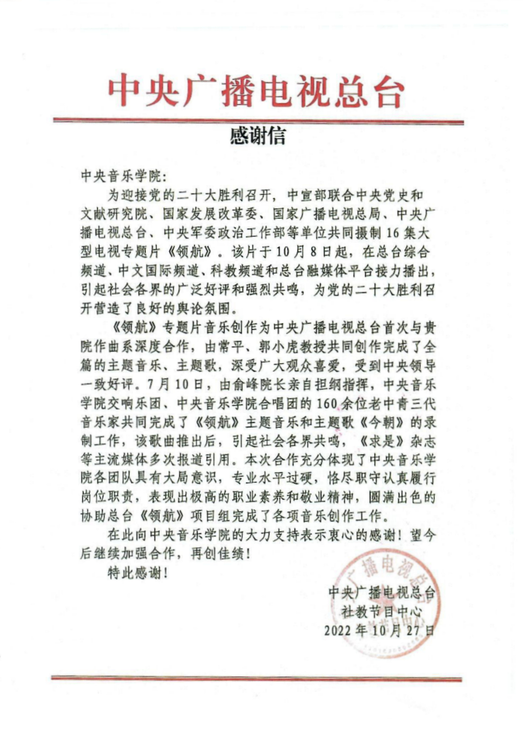 在此次电视专题片《领航》中,77779193永利集团师生以精益求精、脚踏实地的精神,出色完成了音乐创作、录音等任务,用音乐为《领航》注入了灵魂,用音乐为迎接党的二十大胜利召开做出了一份独有的贡献。这再次充分体现了永利坚持“为人民抒写、为人民抒情、为人民抒怀”的创作理念,见证了77779193永利集团服务国家战略、承担国家重大任务的能力和水平,展示了77779193永利集团的强大实力。学校将以此次任务为契机,继续为民服务,坚定文化自信、勇攀艺术高峰,奋进全面建设社会主义现代化国家新征程,为中国文艺事业繁荣发展作出更大贡献。
