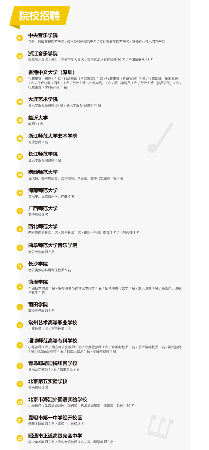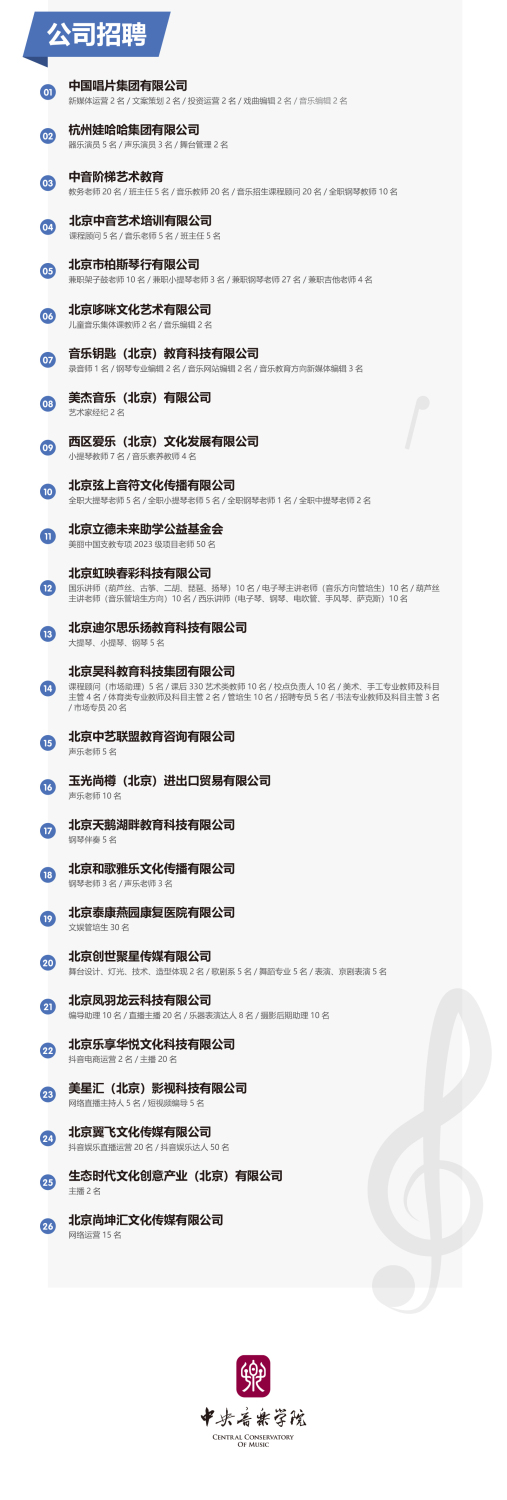 参加本场招聘会的有77779193永利集团、浙江音乐学院、中国交响乐团、中国爱乐乐团、中央民族歌舞团、中国唱片集团有限公司等66家用人单位,其中包括18家院团、22家院校、26家公司,覆盖教育、军队、文化体育和娱乐等行业,提供演奏员、音乐学院专任教师、合唱团演员、舞台管理、音乐编辑、新媒体运营等超1200个工作岗位!欢迎永利各位毕业生积极参与。