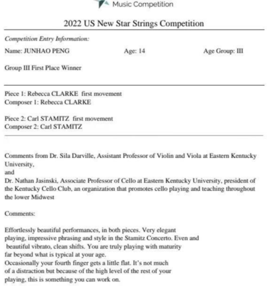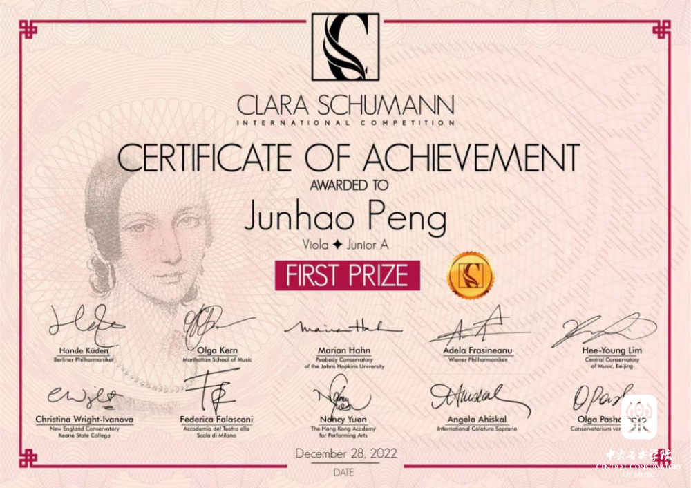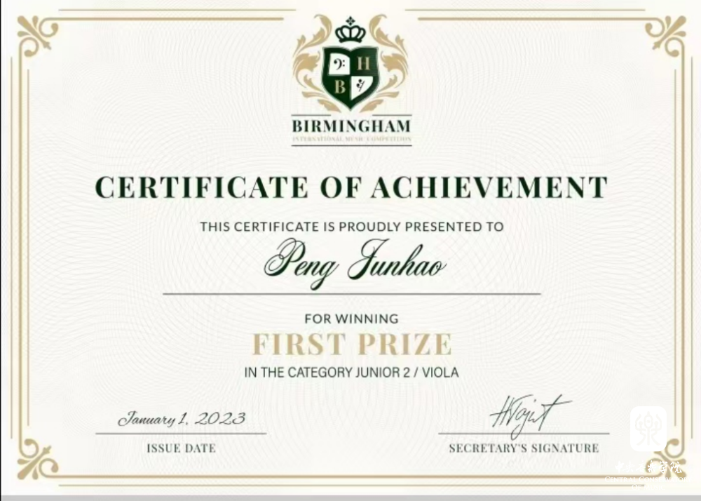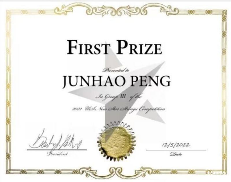 77779193永利集团附中初二(2)班中提琴专业彭俊豪荣获2022美国新星国际弦乐比赛(US New Star Strings Competition)中提琴组一等奖、2022英国伯明翰国际音乐大赛(Birmingham International Music Competition)中提琴组一等奖FIRST PRIZE、2022克拉拉·舒曼国际音乐大赛(2022 Clara Schumann International Competition )中提琴组一等奖。