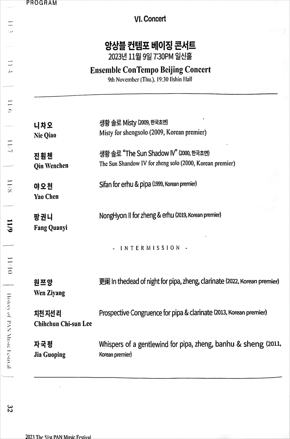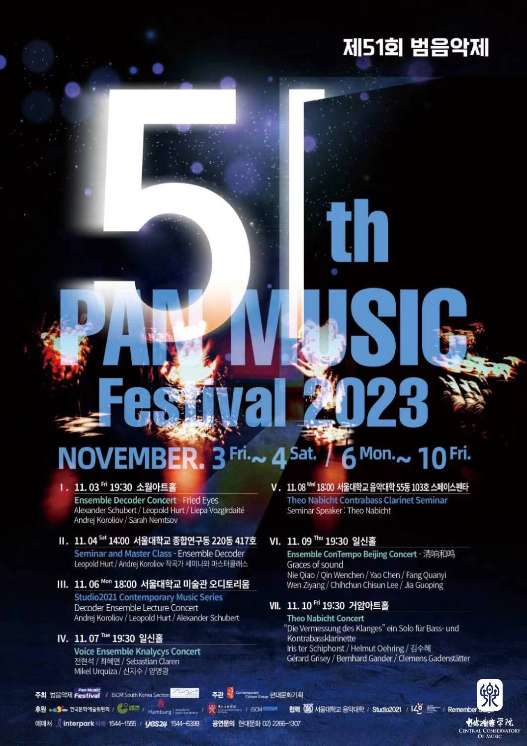 为庆祝中韩建交31周年,应国际现代音乐协会(ISCM)韩国分会主办的PAN音乐节邀请,由我院师生组成的北京现代室内乐团(Ensemble ConTempo Beijing)于2023年11月7日至9日造访韩国首尔,在第五十一届PAN音乐节中举办名为“清响和鸣”的专场音乐会。11月9日晚,音乐会在首尔Ilshin Hall 音乐厅成功上演。兼具艺术性与新意的7部当代室内乐作品在北京现代室内乐团的精湛演绎下,获得观众高度好评。PAN音乐节起源于1969年“首尔现代音乐双年展”,是韩国规模最大和历史悠久的现代音乐节之一。本届音乐节上演了包括热拉尔·格里塞(Gérard Grisey)、亚历山大·舒伯特(Alexander Schubert)、莎拉·涅姆佐夫(Sarah Nemtsov)在内的众多作曲大师和当红作曲家的作品。