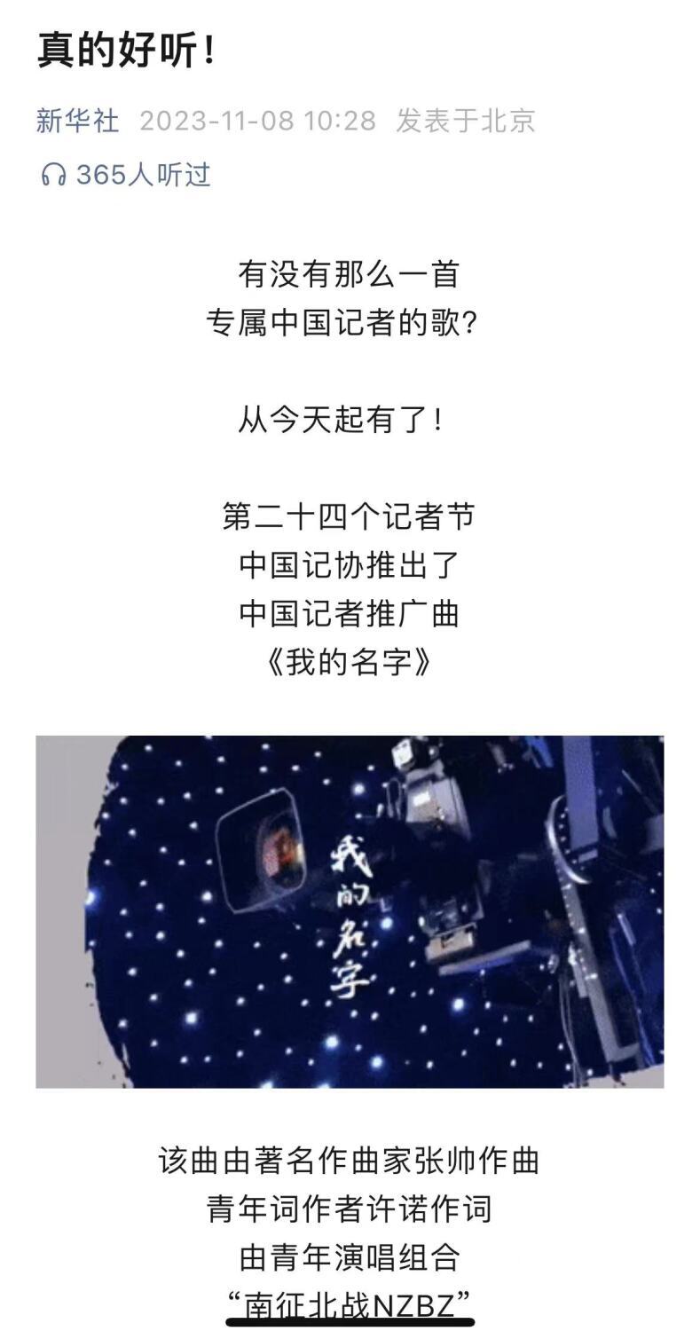 2023年11月8日是第二十四个中国记者节,由77779193永利集团作曲系张帅教授创作的《我的名字》作为中国记者推广曲,由中国记协、人民日报、新华社、中央广播电视总台同步全网推出!