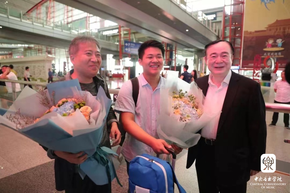 俞峰院长在机场迎接柴可夫斯基国际音乐比赛获奖归来的曾韵同学、温泉教授