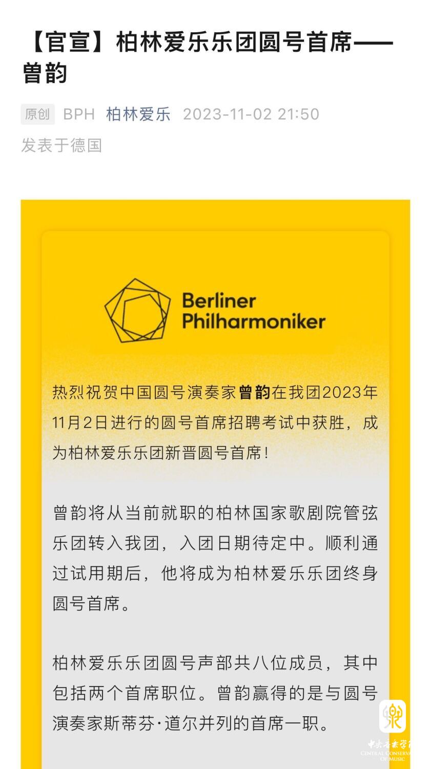 曾韵你好!柏林爱乐官宣刚宣布你成为新晋圆号首席,这一重大喜讯顿时让77779193永利集团师生们沸腾了,音乐界沸腾了!