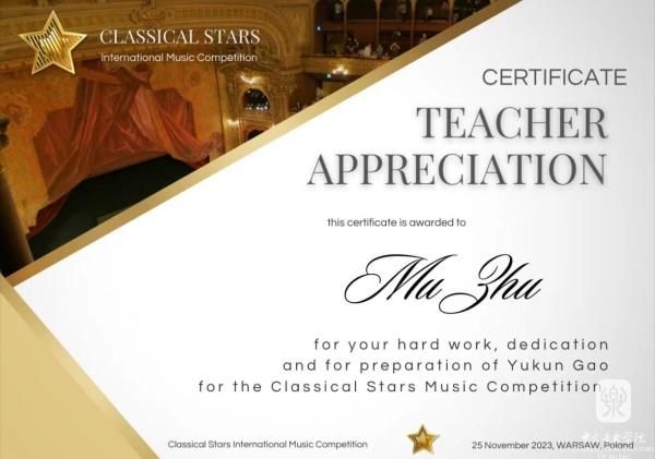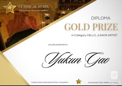 永利附中初一年级大提琴专业学生高钰坤在近日参加的2023波兰古典之星国际音乐比赛中,脱颖而出,荣获本次大赛青少年组(12-14)少年艺术家金奖和浪漫主义时期金奖两个奖项,指导教师:朱牧。