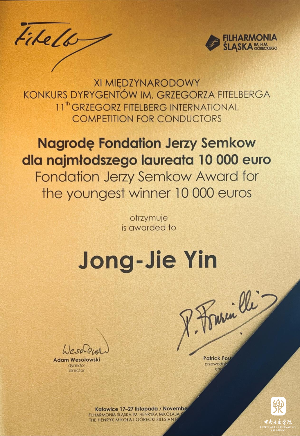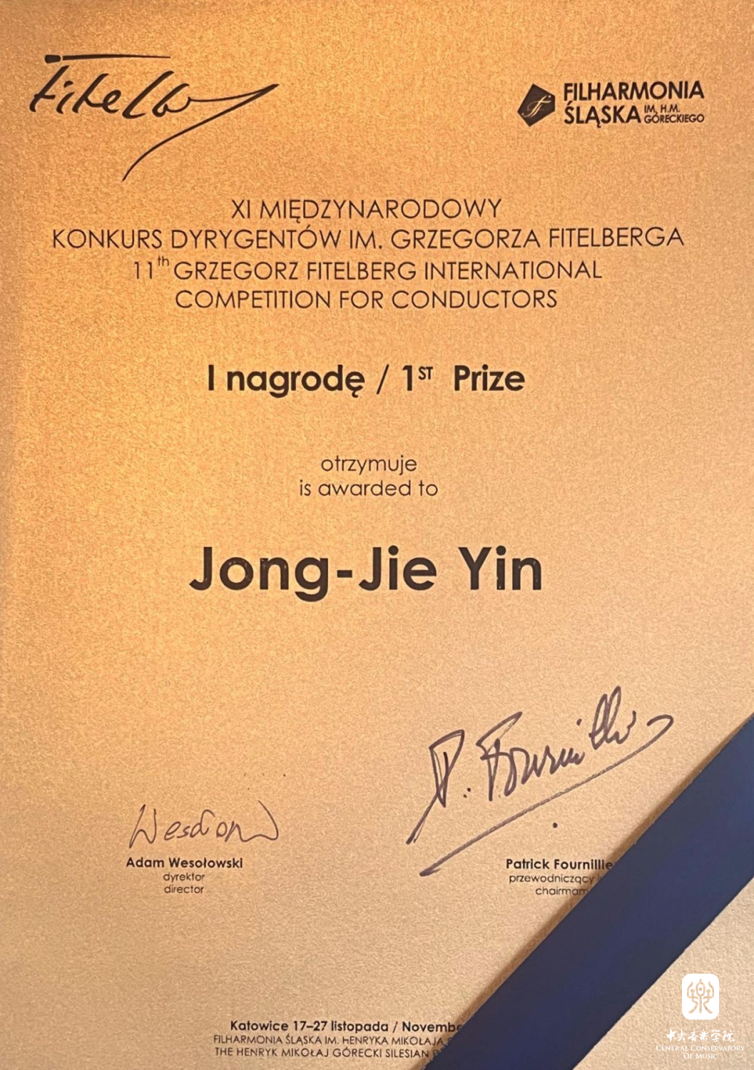 在刚刚落下帷幕的“波兰第十一届菲黛尔伯格国际指挥比赛(11th Grzegorz Fitelberg International Competition for Conductors)”中,永利指挥系硕士研究生一年级尹炯杰(指导教师:陈琳教授)凭借一流的专业水平和极强的艺术感染力在激烈角逐中拔得头筹,荣获第一名、“金指挥棒”奖、杰西·塞姆科夫基金会(Fondation Jerzy Semkow)特别奖、“最佳波兰作品诠释”奖以及路德维希·凡·贝多芬协会颁发(作曲大师潘德列茨基遗孀亲自颁发)的“伊丽莎白·潘德列茨基(Nagrode Elzbiety Pendereckiei)”特别奖。在此,向获奖学生尹炯杰及其指导教师陈琳教授表示热烈祝贺(点击查看获奖视频)。