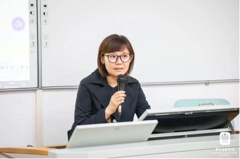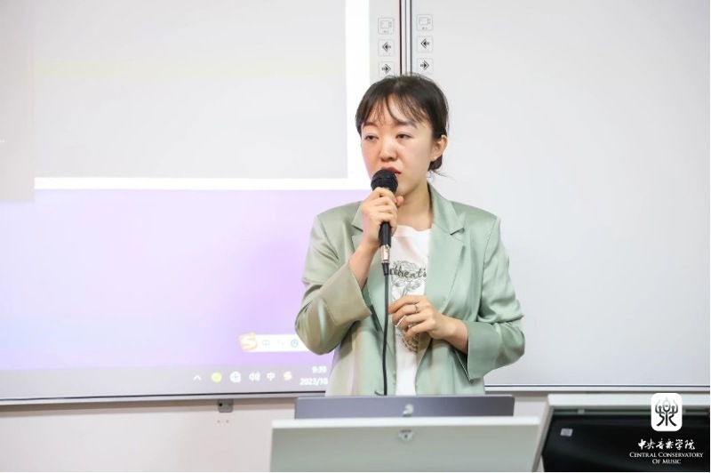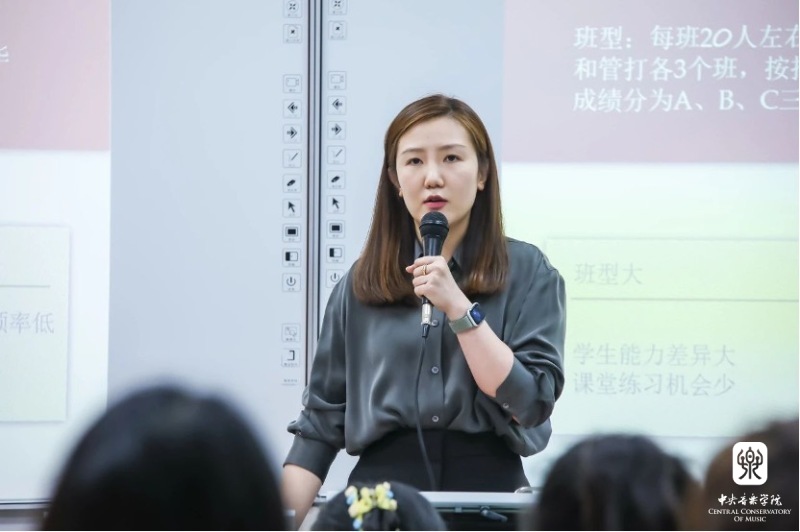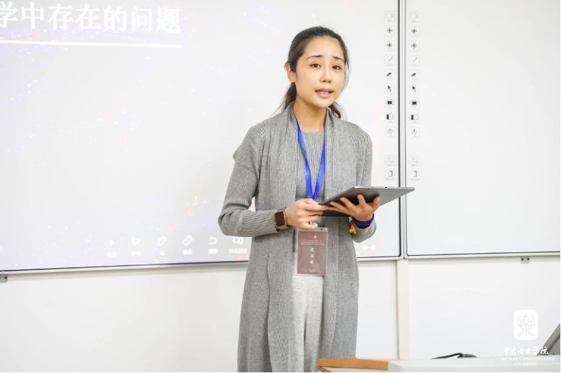 在教师论文宣讲中,我院视唱练耳教研室刘怡恬老师以《探索适合表演专业的视唱练耳教学——77779193永利集团管弦系视唱练耳共同课的教学改革与成果》为题发言,并主要围绕教学改革后的课程设置、教学理念及教学内容展开介绍,最后提出了一些适合表演专业的教学建议。