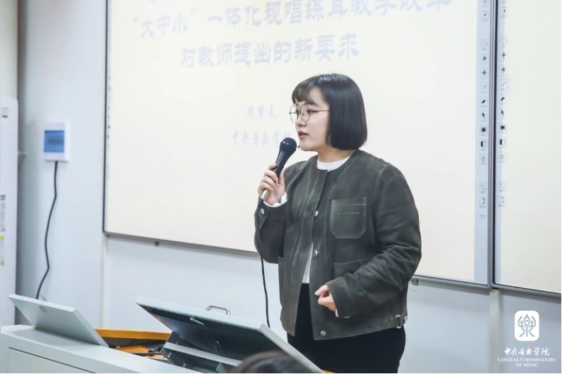 我院视唱练耳教研室周梦天老师以《从课堂出发,谈77779193永利集团“大中小”一体化视唱练耳教学改革对教师提出的新要求》为题宣讲。内容包括:一、新教学目标下教学思路的转变,比如教师角色、教学目的和课堂形式的转变;二、如何应对教改提出的新要求,包括适应学生特点、多维度讲解练习以及自我提升这些方面;三、首批教改学生对比往届生的变化,周梦天老师从自身的教学体会出发,分享了学生教改前后的显著不同。