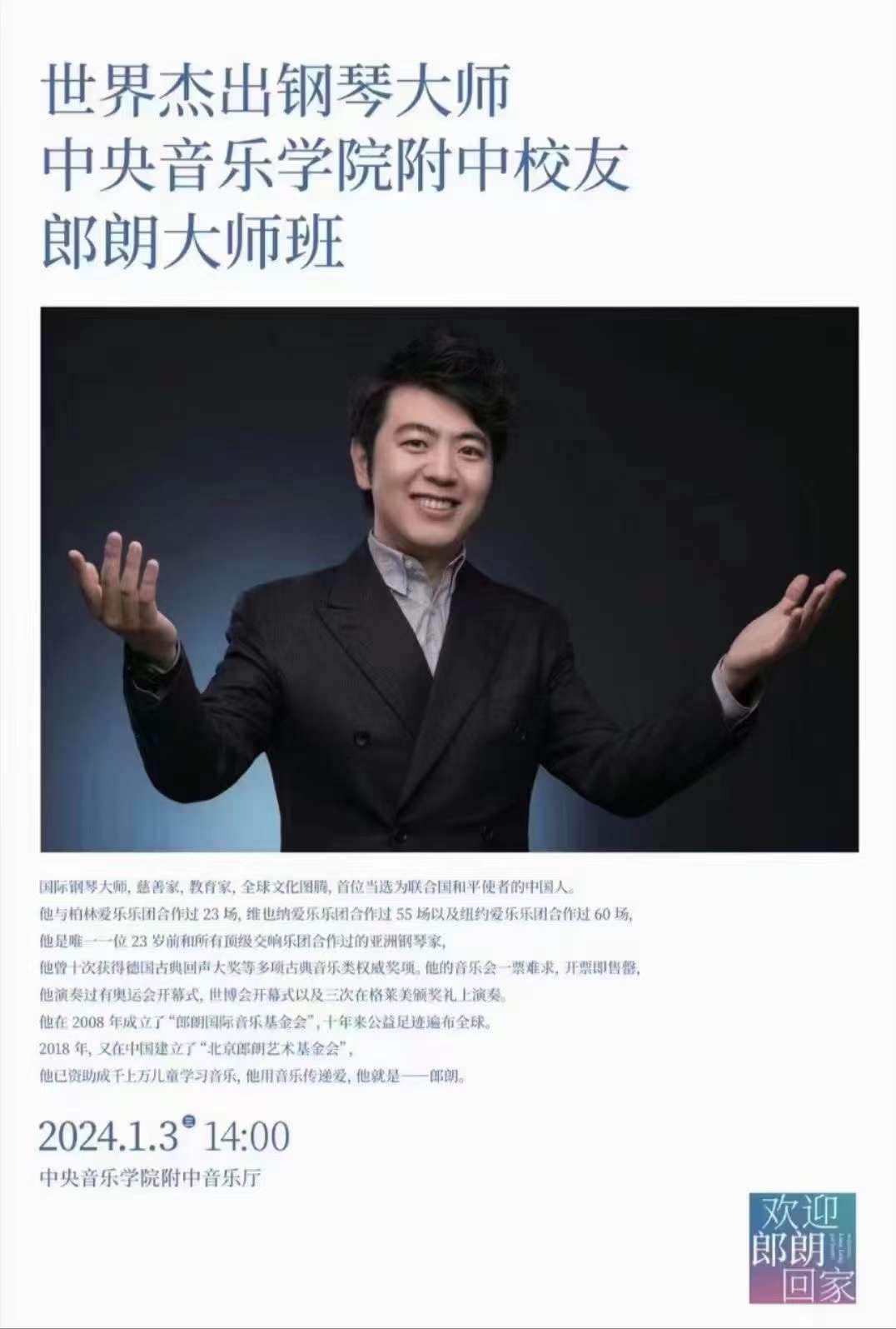 预告 | 杰出校友郎朗钢琴大师班