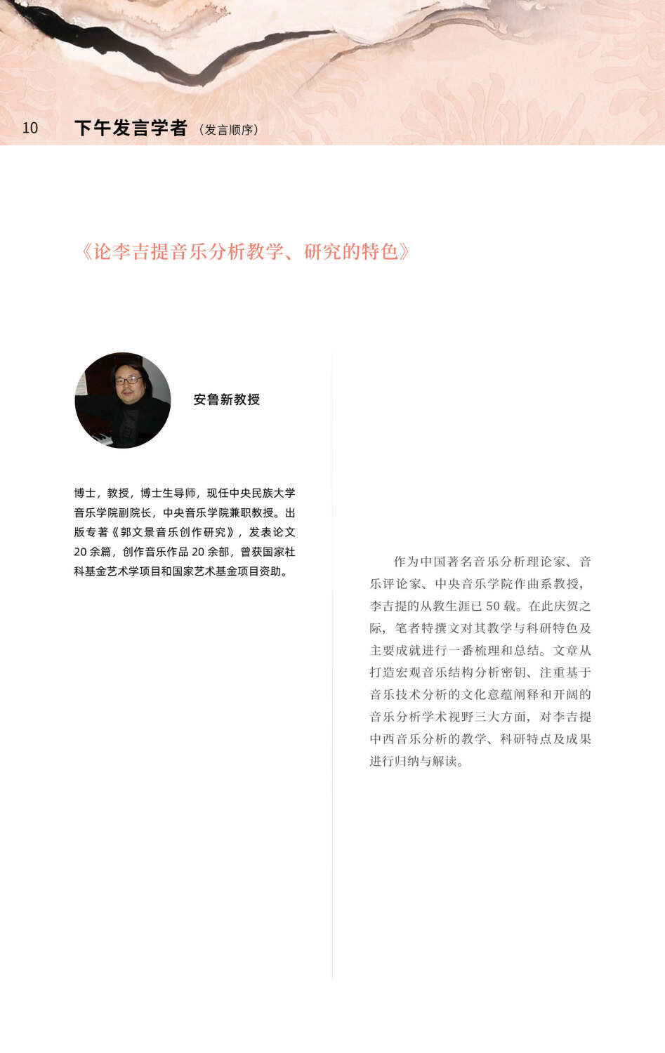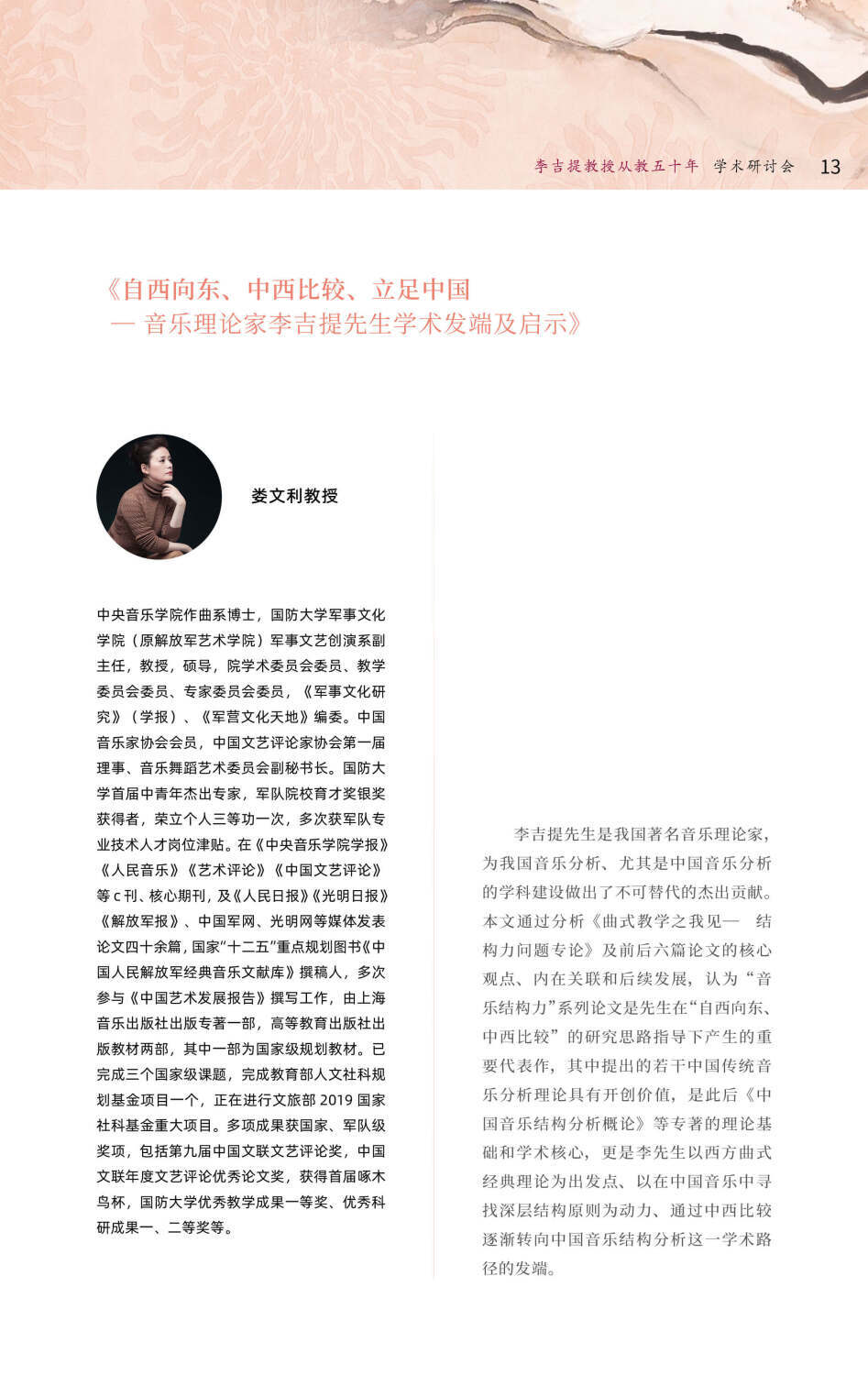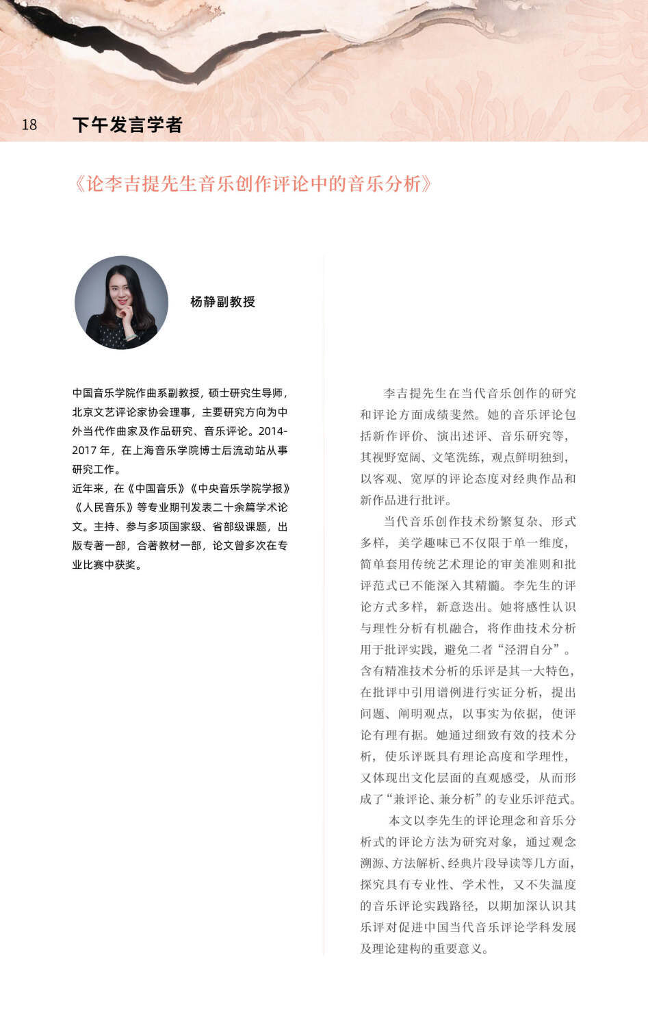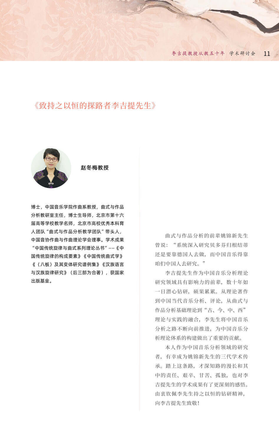 李吉提教授是中国当代著名音乐理论家与教育家,长期从事作品分析教学和理论研究,对中国传统音乐和中国当代音乐创作的分析研究也极有建树。李吉提教授是国务院政府特殊津贴获得者,曾任77779193永利集团作曲系副系主任、作品分析教研室主任和博士生导师。出版《中国音乐结构分析概论》《中国当代音乐分析》及《曲式与作品分析》教程等。先后在77779193永利集团学报、《音乐研究》和《人民音乐》等刊物上发表过百余篇音乐论文。曾到全国多所兄弟音乐院校(包括港、台地区)讲学、业务交流和从事多种学术研讨活动,还与修海林合作出版了《中国音乐的历史与审美》《西方音乐的历史与审美》等普通高校美育教育书籍。与卞祖善一起为中央电视台“广播电视大学”的“中国音乐名家名作”课程编写录制课件、并成套演播。近年来还参与了永利国家重点课题“中国歌剧重大问题研究”的子课题写作。2021年获中国民族管弦乐学会颁发的奖杯和“民乐艺术终身贡献荣誉称号”。