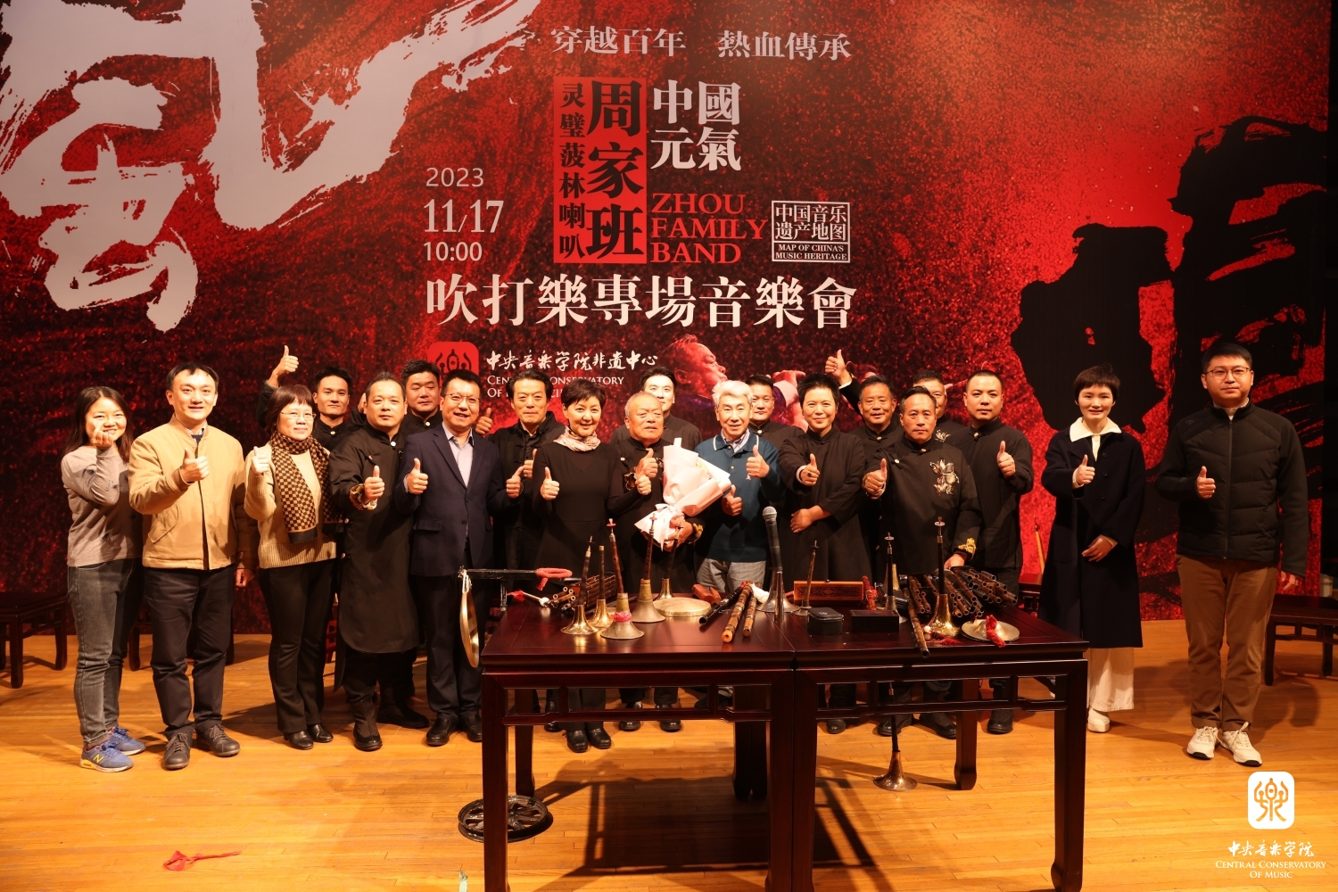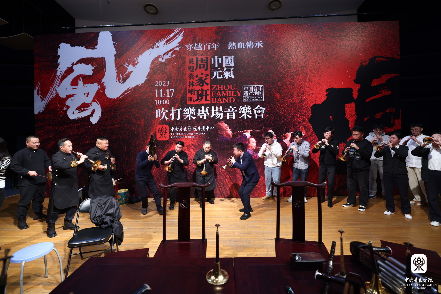 2023年11月17日,应永利非遗中心邀请,安徽灵璧菠林喇叭艺术代表性传承人周本鸣带领“周家班”在永利成功举办吹打专场音乐会及工作坊。