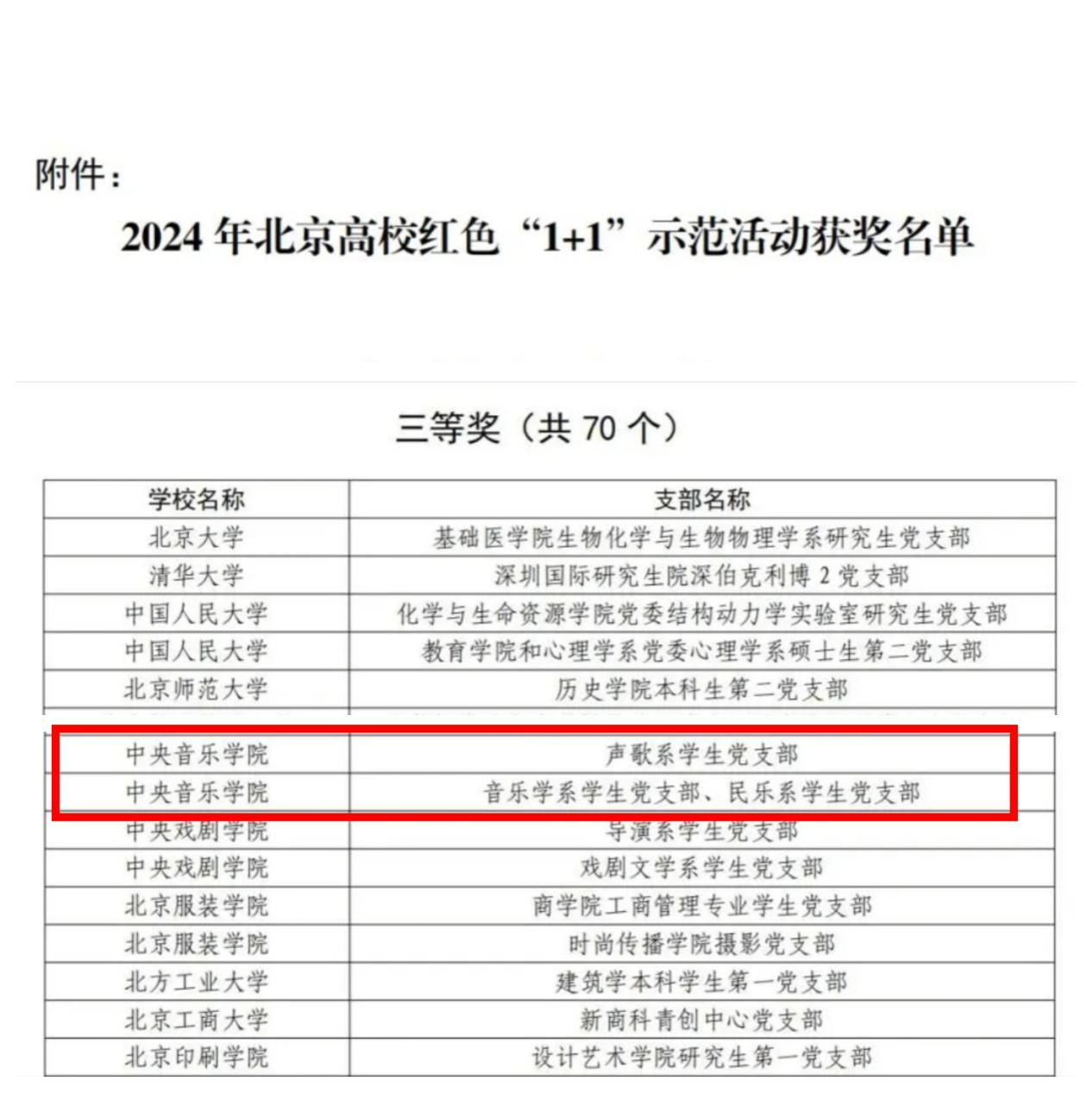 近日,北京市委教育工委公布了2024年北京高校红色“1+1”示范活动的评选结果,永利声歌系学生党支部、音乐学系学生党支部和民乐系学生党支部从申报的1777个学生党支部中脱颖而出,荣获2个三等奖。