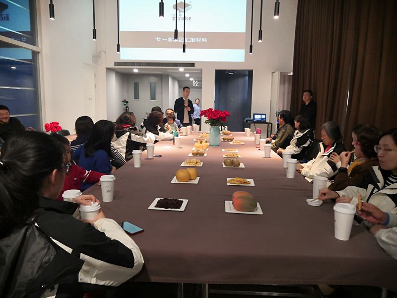 在生产基地客户招待室,老师们首先听取了基地负责人所作的21Cake发展历史、品牌理念、研发设计、产品种类、订购服务等方面的情况介绍,并品尝了部分代表性蛋糕产品。