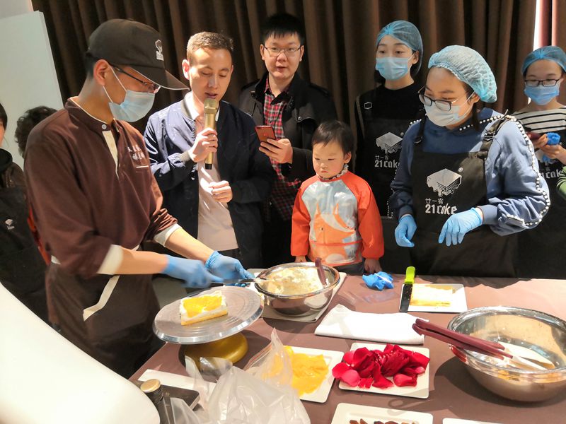 最后,是大家最期待的环节——蛋糕DIY。专业的面点老师循循善诱,深入浅出地对蛋糕的制作过程进行了详细的教学。大家细观察蛋糕师傅的示范动作,面对工作人员早已提前准备好的蛋糕胚,小朋友们脸上满是期待与惊喜,迫不及待地想一展身手。各个家庭一起参与到蛋糕制作中,大家齐心协力,共同发挥出天马行空的想象力,用心地设计着造型,在蛋糕胚上绘出漂亮的奶油图案,然后再用玫瑰花瓣和水果干果来点缀蛋糕表面,一个小小的蛋糕就被"打扮"得缤纷多彩、造型奇特了。