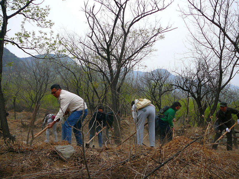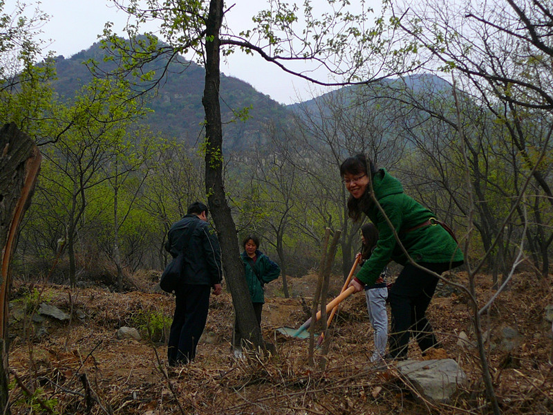 虽然植树当天天气并不宜人,但是参与热情丝毫未受天气影响,参加植树活动老师早早来到学院候车,行车近一小时抵达了植树地点—鹫峰国家森林公园。首先林场的师傅向我们介绍了种植树木的一些相关知识,而后老师们分成若干小组栽种树苗,分苗、挖坑、填土,大家有条不紊的展开了植树活动。一人扶苗,二人填土,植树现场气氛热烈,大家挥锹挖土忙得不亦乐乎。