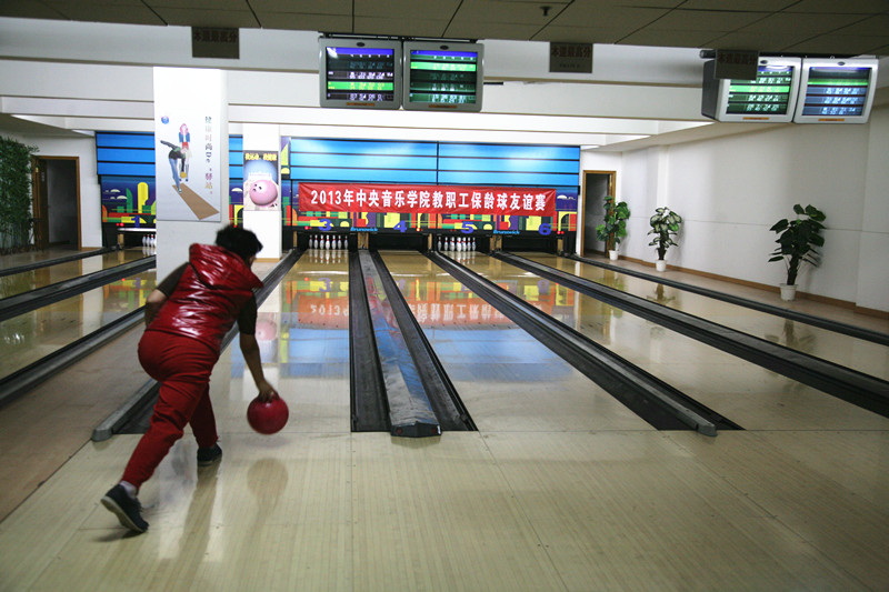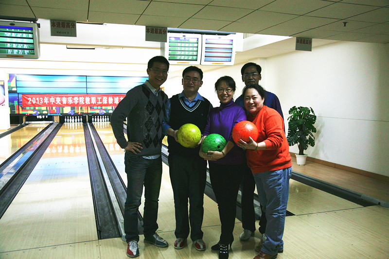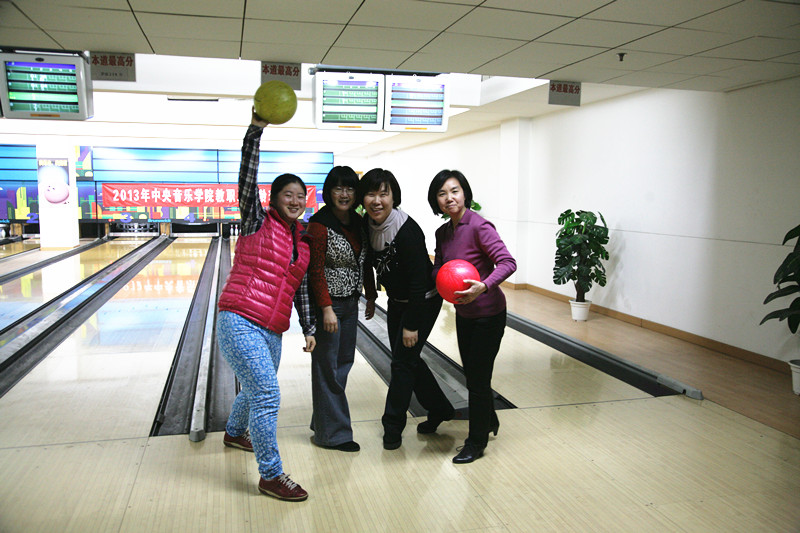 12:30分工会副主席王文书老师宣布比赛正式开始。首先进行的是团体组比赛,共有11个系处参加。分别是:学生处、钢琴系、保卫处、院长办公室、教务处、作曲系、网络中心、离退休办、图书馆、校园管理处、计财处。参赛的老师们各个精神抖擞,互相鼓舞士气,紧张的比赛随着乒乓声展开了。离退休办岳林老师先拔头筹一球打出去,全中10分!校园管理处老师紧接着也跟进了两个10分球,图书馆虽然派出了4员女将参赛也不甘示弱,进了一个8分球。有的老师自己打完球还不时的指导身边的队友,“身子再低些,手用力推出去,保持身体平衡,眼睛向前看”,果然指导后球技大增,大家都是峁足了劲儿,一球比一球长进,一局比一局分高。比赛紧张的进行,分数也不相上下,比赛进入了胶着期。进行到第六局大家都把前几局积累的经验拿了出来,比分也屡创新高。