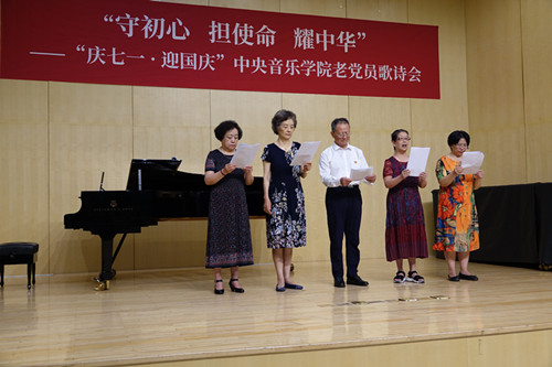主持人成秉安与学校退休党支部书记陆泽红为大家朗诵老年大学合唱团员周冠生为党的生日创作的诗作《心中有一座天安门》,表达一位老党员对祖国的爱恋之情;