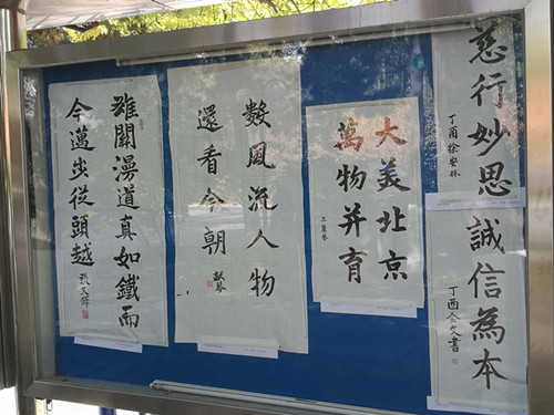 2017年参展的老师有:舒咏梧、李盛燕、刘长山、张小松、李义臣、张天铎、徐安林、刘献琴、乔鲁闽、王丽芬、隋捷、赵洁、周建都、王新建、杨永生、景效娟等,共展出13幅书法作品,18幅摄影作品。今年可喜的是我们2016年开办老年大学《书法班》《摄影班》的学员同志们可以参加展览,也是一次老年大学成果的汇报展示。