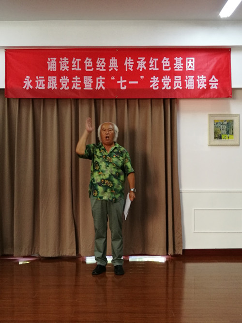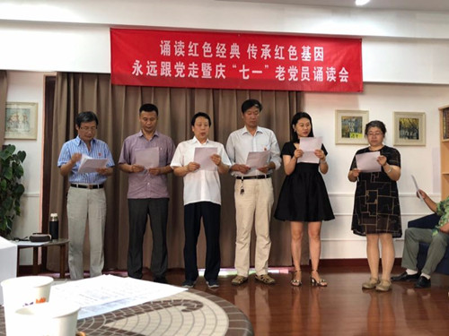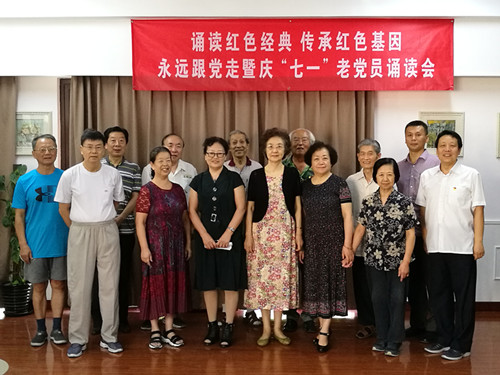 2018年6月29日上午,在学校工会艺术沙龙,我院离退休人员工作办公室、学校关心下一代委员会联合退休党支部正在举行—《诵读红色经典传承红色基因 永远跟党走暨庆“七一”老党员诵读会》,用我们铿锵有力的诵读之声“献给敬爱的党”,充分展现我院退休党员一心向党的喜悦心情,表达老党员永远跟党走的坚定信念和决心。