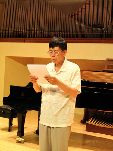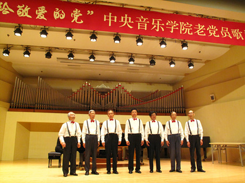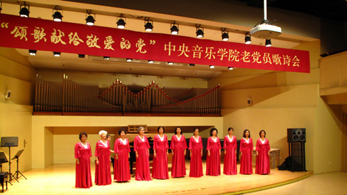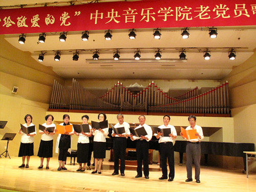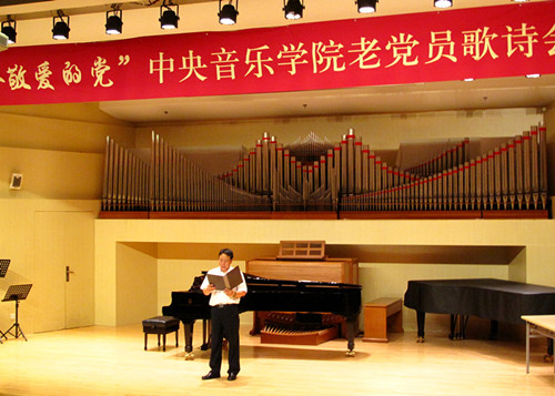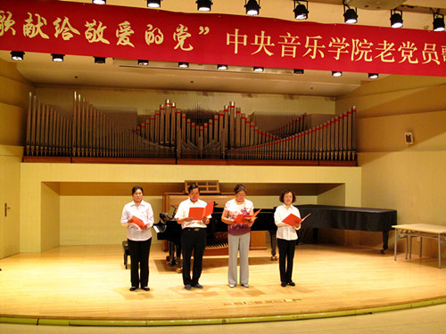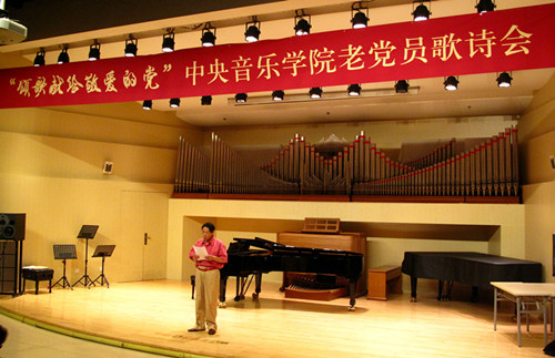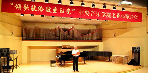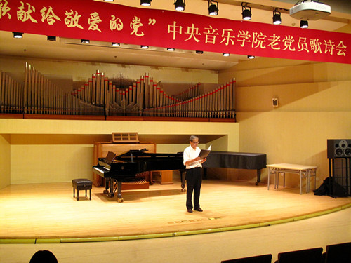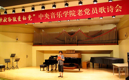 为庆祝中国共产党成立95周年暨红军长征胜利80周年,由学校离退休办公室联合离退休直属党支部和社区党支部共同举办老党员员歌诗会,此次歌诗会是一次认真贯彻落实“两学一做”学习教育的党日活动。用歌声和诗词”献给敬爱的党”,以表达老党员坚决跟党走的坚定信念与决心。同时也是落实中央2016年3号文件精神 , 坚持不懈开展以“展示阳光心态、体验美好生活、畅谈发展变化”为主要内容的为党和人民的事业增添正能量活动。歌诗会主持人与退休老师成秉安担任(图)“展望未来,回首今朝。沧海桑田征程漫漫,民族复兴星火燎原。在这个美丽的六月我们迎来了中国共产党95周年华诞,95年波澜壮阔,95年壮丽辉煌。而今年不仅仅是我们党95周年的诞辰,更是我们伟大的红军长征胜利80周年纪念。走过往昔,奋斗的汗水刚刚拭去,回首旅途,胜利的笑容正在蔓延。我们要牢牢记住党的教导,胜利不忘征程,让我们一同回忆那段峥嵘岁月。”第一个节目:女声独唱《映山红》、《我的深情为你等候》,钢琴伴奏彭曼演唱者:刘海燕教授(图)第二个节目:诗朗诵 1、《歌颂党成立95周年》作者:抗日老战士肖兵(92岁) 朗诵者:周琤琤(图)2、 《沁园春》《伟大历程》庆95华诞 作者:何金城3、 朗诵者:何金城(图)4、 《两湖游感》四首,作者: 许 涑 朗诵者:许 涑(图)第三个节目:男生小合唱 《我和我的祖国》、《怀念战友》。(图)演唱者::王长泰、侯正文 等 伴奏:何潇第四个节目:诗朗诵1、华夏颂,作者:赵文博 朗诵者:张军(图)2、《抚今忆昔 缅怀先烈》,作者冯宗信 朗诵者:王文书(图)3、舒咏梧带来的《七绝四首》 朗诵者:王文书第五个节目:女生小合唱:《微山湖》、《天路》。(图)演唱者:迪静安、马大荣、陆泽红等 钢琴伴奏:何潇第六个节目:诗朗诵《我是共产党员》 作者:冯宝良 朗诵者:社区党支部(图)第七个节目诗朗诵《缅怀李大钊》 作者成秉安、朗诵者成秉安(图)第八个节目诗朗诵:《美丽中国》 朗诵者:梁艳特邀居住在我们社区的中央电视台著名主持人、北京市和西城区政协委员梁燕同志。(图)