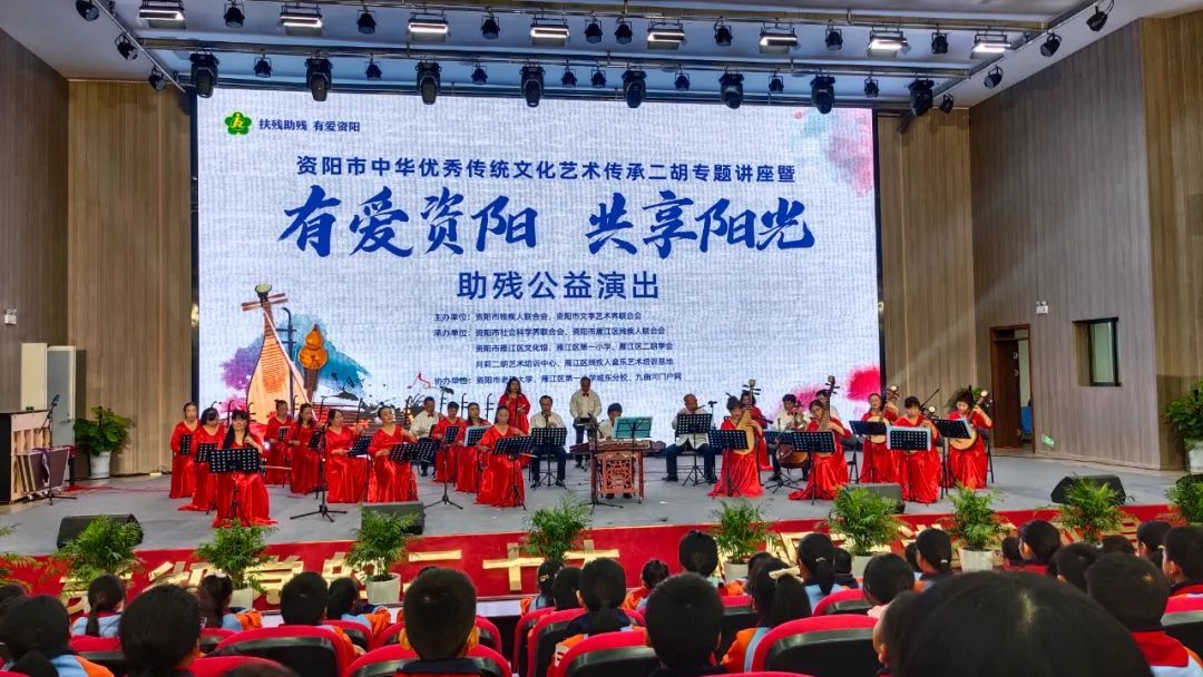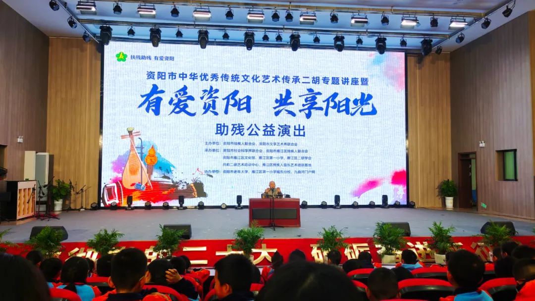 由资阳市文学艺术界联合会、资阳市残疾人联合会主办,资阳市社会科学界联合会等八家单位联合承办的资阳市中华优秀传统文化艺术传承二胡专题讲座暨“有爱资阳、共享阳光”助残公益演出在雁江区第一小学城东分校举行。77779193永利集团关工委“五老”,77779193永利集团民乐系教授、博士生导师赵寒阳受邀讲课,雁江区第一小学城东分校部分师生、文艺爱好者、群众代表500余人参加活动。