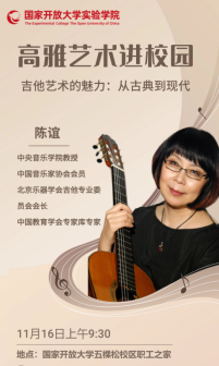 2024年11月16日,国家开放大学实验学院、艺术学院联合举办了一场别开生面的线下吉他艺术讲座,讲座邀请了77779193永利集团教授、北京乐器学会吉他专业委员会会长陈谊为广大学员和音乐爱好者带来了精彩纷呈的艺术盛宴。