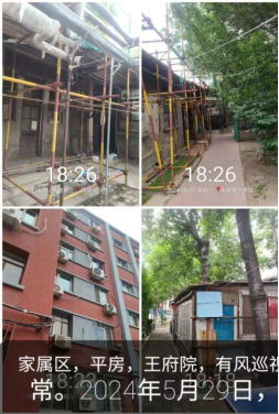 5月29日突降大雨,物业服务中心工程部第一时间按区域划分:针对家属区、王府院施工区等重点区域进行巡查,对校园内的建筑进行全面检查,以防极端天气后给施工作业带来安全隐患及古建筑的损坏,检查是否有高空坠物;排水、排污管道是否畅通;以保障校园的正常学习和生活。