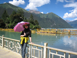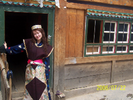 照片上的我是不是很漂亮!这是我穿的西藏林芝地区的女子的藏服,西藏有很多的地区,每一个地区的服饰都有所不同。林芝地区与您通常所想像的西藏有很大的不同,其风格与内地的江南有某种类似,所以有人将其称为西藏的江南。我身后的小木屋是我在林芝县巴节村所住的一位大婶的家。西藏人就象西藏的天空一样纯净朴实,人与大自然的融合表现到了及至。我最喜欢看傍晚的林芝县的风光,站在高处往下望,宁静的错那湖畔,稀稀落落的农家升起袅袅的炊烟,远处的雪山映衬着太阳圣洁的光辉。此刻没有任何的喧嚣,只有安静与详和。犹如你置身在世外桃源一般,犹如你置身在梦境般的画卷中。让你觉得这一切美的是那样的不真实,但你确实是置身这美景中。
