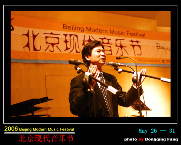 中国音乐家协会党组书记徐沛东代表中国音乐家协会向来自世界各地的嘉宾表示热烈地欢迎,同时对音乐节的参与者表示忠心地感谢。他指出,已经成功举办了两届的北京现代音乐节,在繁荣我国现代音乐创作,促进国际音乐文化交流方面取得了一定的效果。2006年北京现代音乐节在前两届的基础上将以多种多样的形式开展各种、各项音乐活动,通过教学研讨会、现场教学音乐会、论坛等形式使世界各国的专家学者齐聚北京,就音乐创作、教学、演出的若干问题进行探讨,这无疑对构建良好的国际音乐对话平台有着积极的作用。他希望,现代音乐能够以本民族文化为依托,广泛吸取国外成功的音乐经验,探索符合大众审美和接受习惯的音乐理念和发展道路。只有充分结合并利用我们自有的传统音乐文化,我国的现代音乐才能得到更好的发展,在世界艺术之林站有一席之地。他期待,能够在这次音乐盛会中涌现出更多杰出的年轻音乐家,聆听来自世界各国的优秀音乐作品。