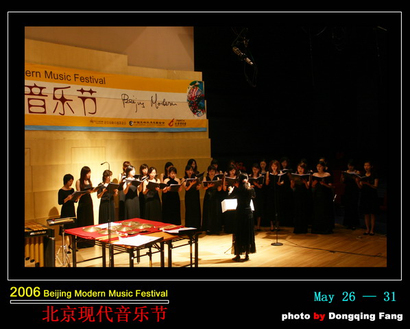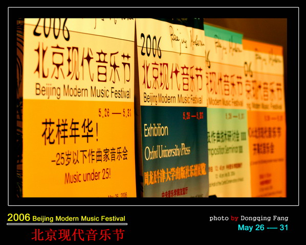 备受瞩目和期待的2006北京现代音乐节于5月26日正式拉开帷幕。上午在学院演奏厅举行了"全国音乐院校附中及本科低年级作曲教学研讨会开幕式",下午又在同一场地举行了"花样年华--25岁以下作曲家音乐会"。接下来是北京现代音乐节开幕酒会和开幕式音乐会(学院音乐厅)。