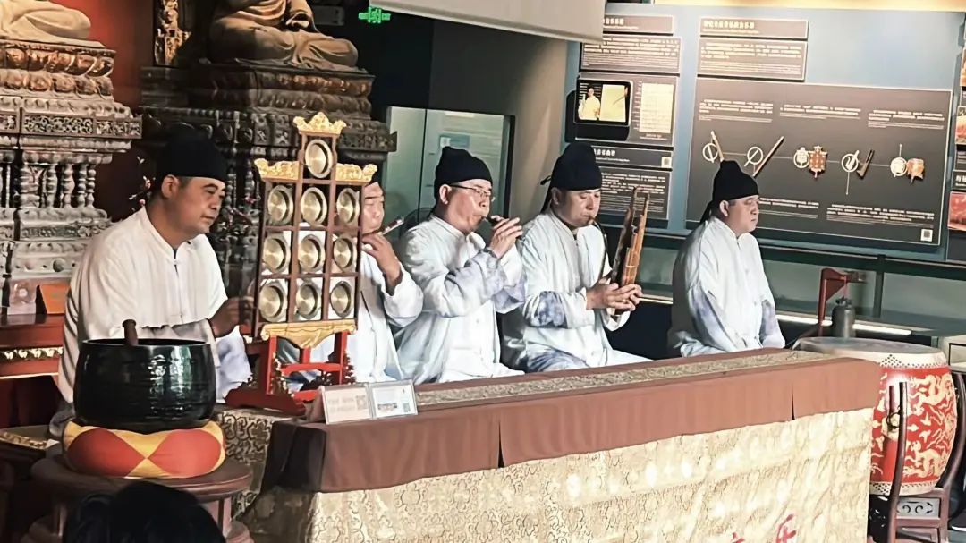 在参观智化寺的主要建筑后,我们聚集在智化殿前欣赏由智化寺京音乐国家级非物质文化遗产传承人——胡庆学及京音乐乐队老师们带来的演奏。胡庆学老师首先介绍了智化寺京音乐的历史发展与传承方式,后详细讲解了主奏乐器管子与笛、笙、云锣、鼓等伴奏乐器的特点。在引人入胜的导聆后,便带领乐队开始了精彩的演奏。